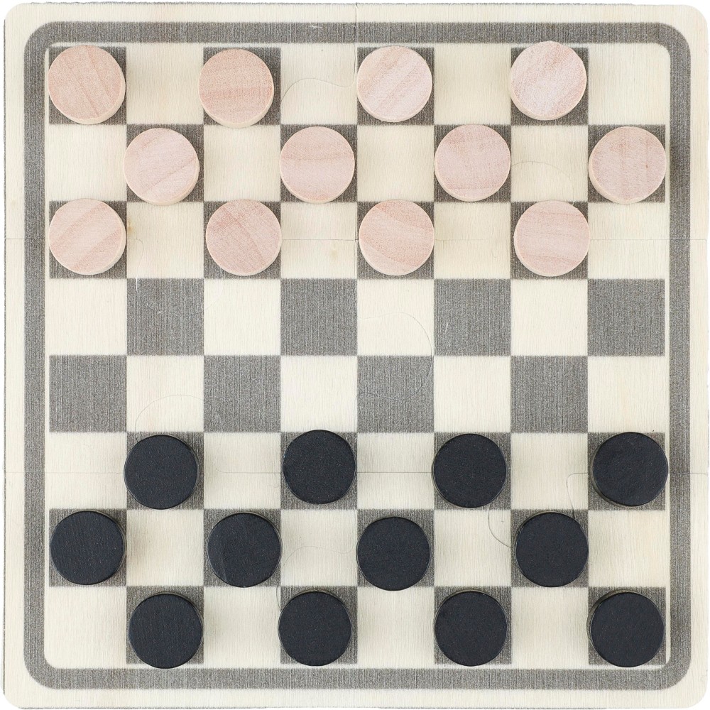 Fa sakk- és dámajáték pamut zsinóros tasakban. Tartalmaz egy 6 darabból álló, nyomtatott puzzle-t, amely összerakható a játéktábla létrehozásához, valamint 16 nyomtatott fa zsetont, amelyek sakkfigurákat ábrázolnak. A játéktér anyaga rétegelt lemez, a zsetonok anyaga fenyőfa. Emblémázás: Szitanyomás