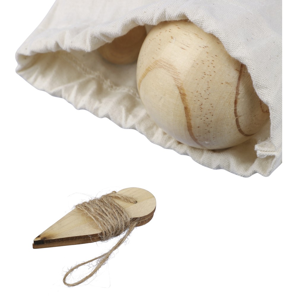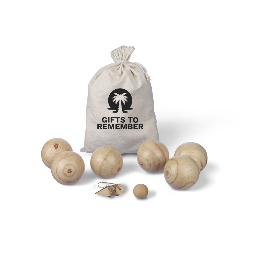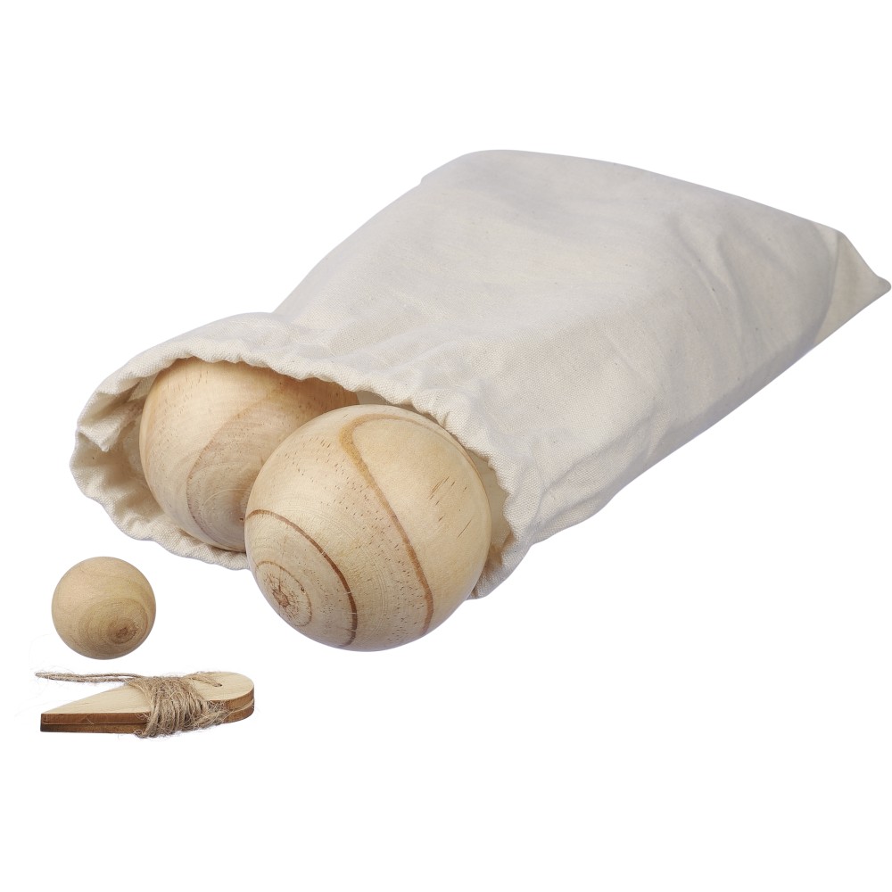 Fa labdajáték készlet 6 db, egyenként 7 cm átmérőjű labdával, egy kisebb, 2 cm-es golyóval és mérőzsinórral. Vászontasakba csomagolva. 4-6 játékos számára. Emblémázás: Szitanyomás