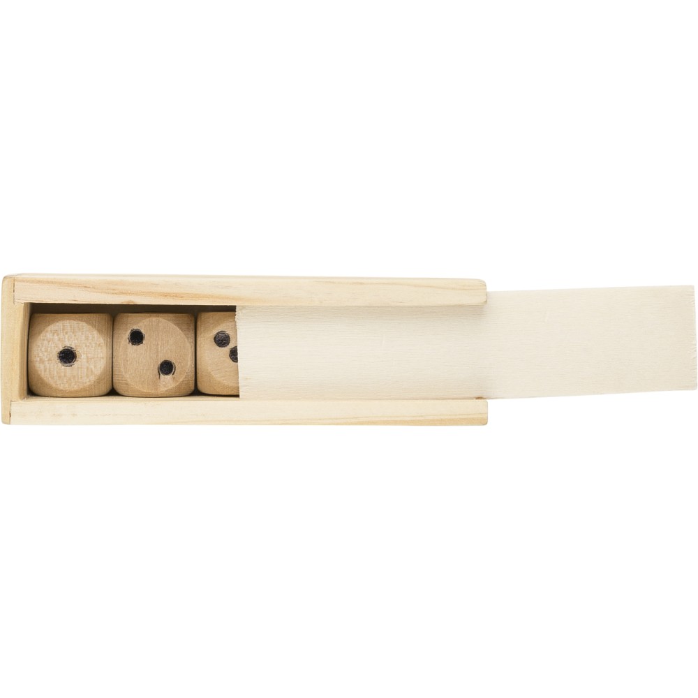 Bükkfából készült, 5 nyomott dobókockából álló készlet hozzá illeszkedő tolófedeles dobozban. Darabonként barna kartondobozba csomagolva. Emblémázás: Gravírozás, Tamponnyomás