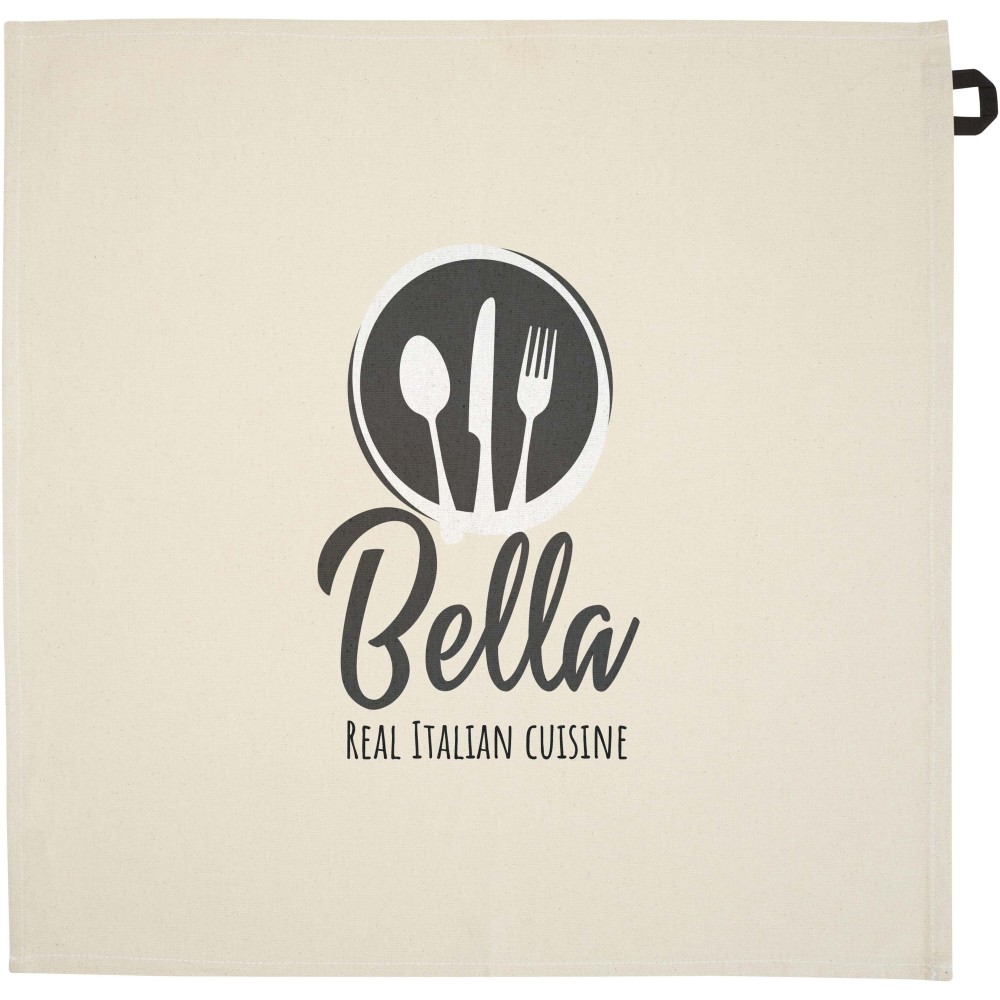 Konyharuha 100% GRS tanúsítvánnyal, 200 g/m2 újrahasznosított pamutból készült, és jellegzetes kontrasztos akasztóval rendelkezik. Mérete: 50 x 50 cm. Emblémázás: Hímzés, Szitanyomás