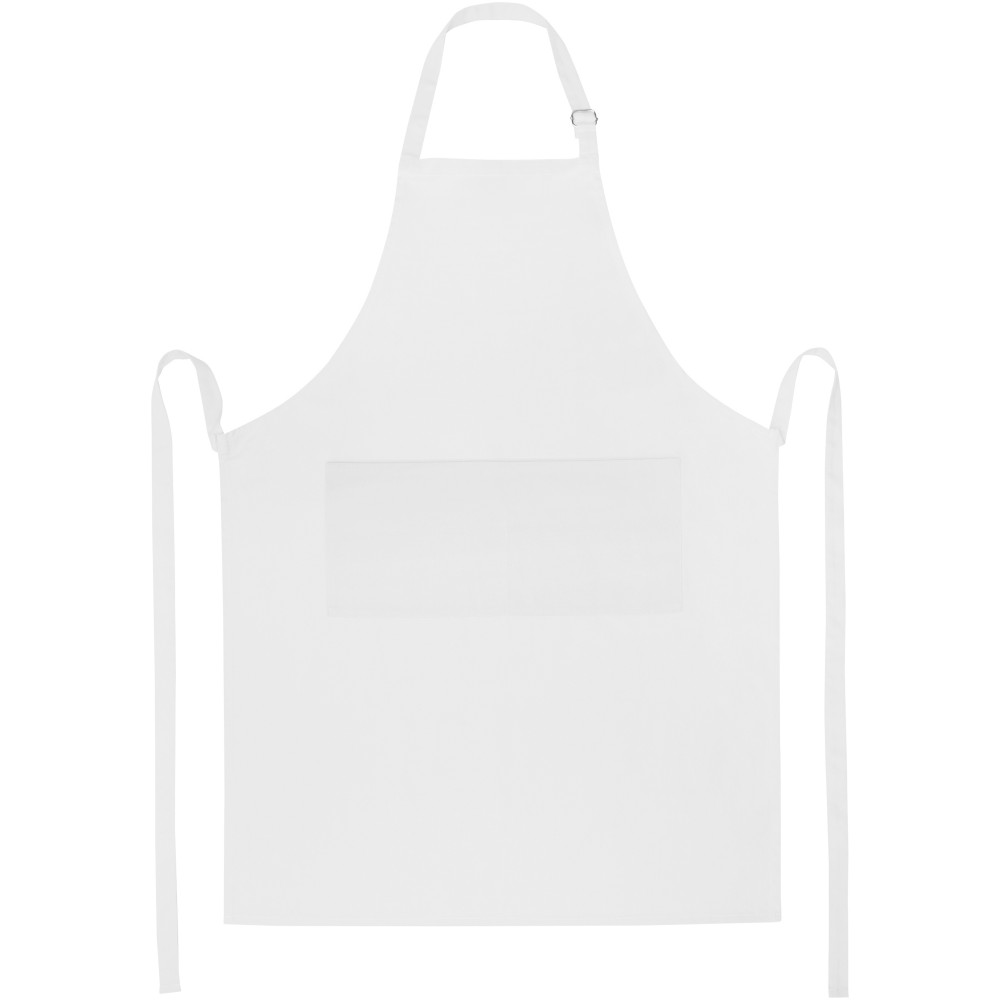 Vastag és masszív anyag, ugyanakkor puha és kényelmes viselet. A két elülső zseb gyors és egyszerű módot kínál a konyhai eszközök tárolására. A kötény nyakában csattal állítható, hátul megköthető. Nagyméretű nyomtatási lehetőség a logók megjelenítéséhez. Pamut twill 65% poliészterből és 35% pamutból, 240 g/m2. Emblémázás: Hímzés, Szitanyomás