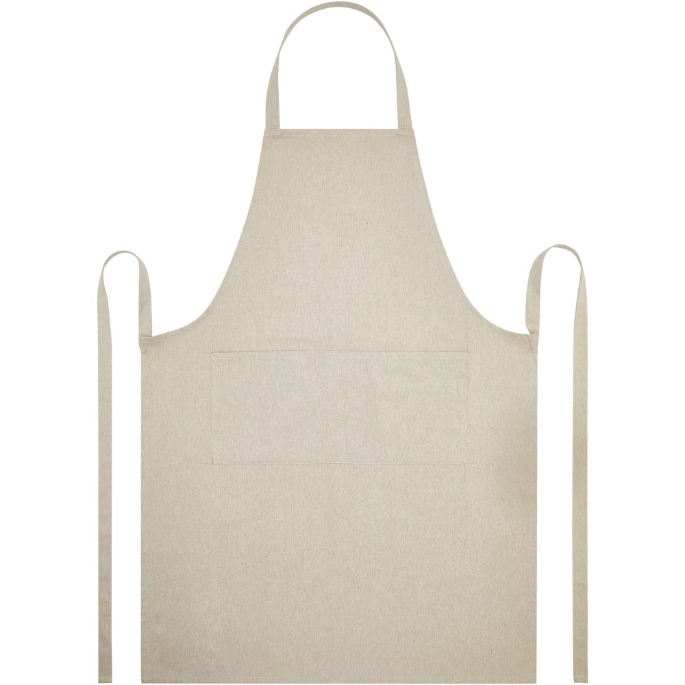A Shara kötény 70% újrahasznosított pamutból és 30% újrahasznosított poliészterből készült, így vastag, strapabíró és kényelmes viselet. A kötény 2 egymás melletti zsebbel (egyenként 22 x 20 cm) és egy 1 méteres megkötővel rendelkezik. A kötény Cyclo újrahasznosított szálakat tartalmaz, ahol előválogatott hulladékot használnak, amely meghatározza a fonal színét. Minden kötényhez egy Aware nyomjelző is tartozik. Ez az innovatív funkció lehetővé teszi a felhasználók számára, hogy egy QR-kód segítségével nyomon követhessék a termék eredetét és útját, növelve az ellátási lánc átláthatóságát és elősegítve a termék és a gyártási folyamat közötti szorosabb kapcsolatot. Emblémázás: Hímzés, Szitanyomás