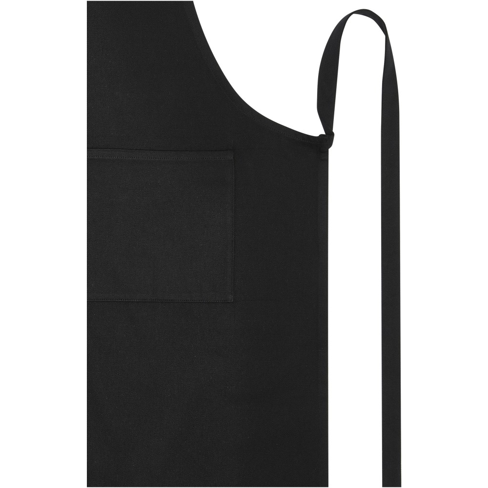 A Shara kötény 70% újrahasznosított pamutból és 30% újrahasznosított poliészterből készült, így vastag, strapabíró és kényelmes viselet. A kötény 2 egymás melletti zsebbel (egyenként 22 x 20 cm) és egy 1 méteres megkötővel rendelkezik. A kötény Cyclo újrahasznosított szálakat tartalmaz, ahol előválogatott hulladékot használnak, amely meghatározza a fonal színét. Minden kötényhez egy Aware nyomjelző is tartozik. Ez az innovatív funkció lehetővé teszi a felhasználók számára, hogy egy QR-kód segítségével nyomon követhessék a termék eredetét és útját, növelve az ellátási lánc átláthatóságát és elősegítve a termék és a gyártási folyamat közötti szorosabb kapcsolatot. Emblémázás: Hímzés, Szitanyomás