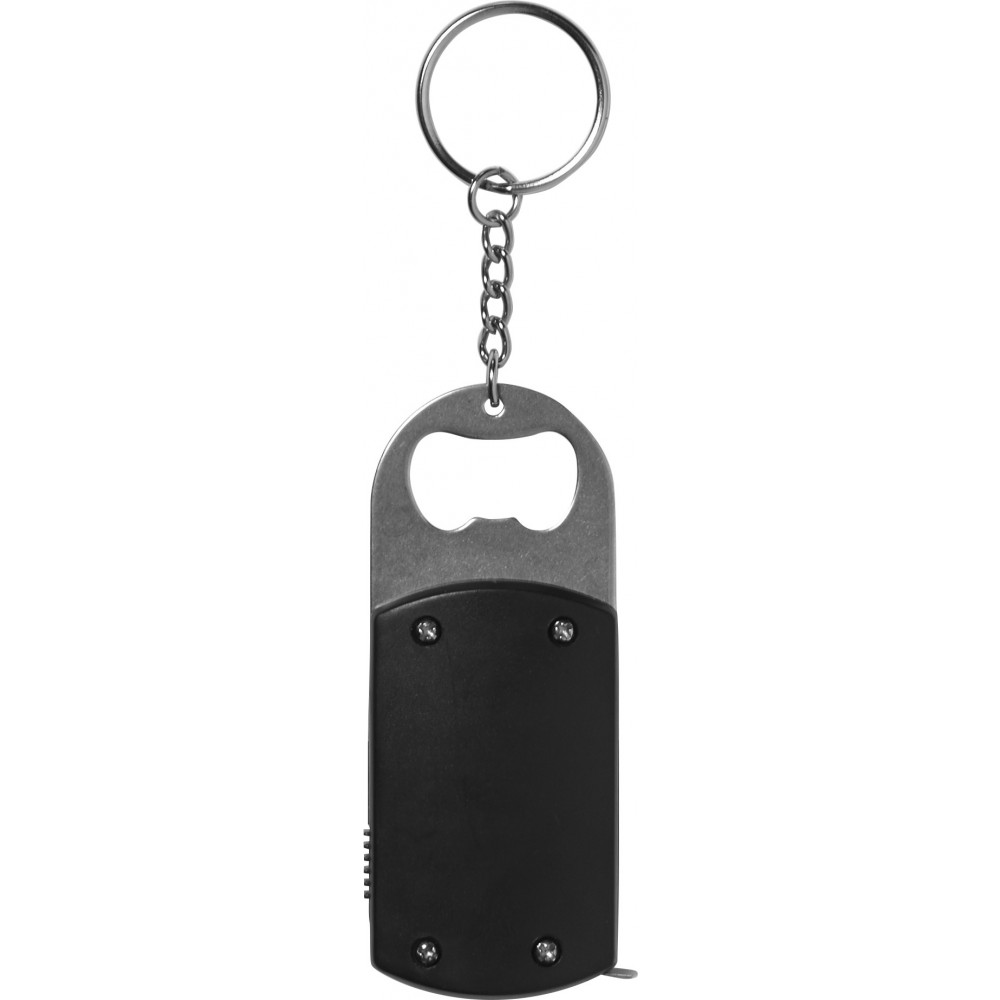 Fém üvegnyitó kulcskarikával, egy fehér LED fényforrással és mérőszalaggal. Az elemet tartalmazza. Emblémázás: Tamponnyomás, UV nyomtatás
