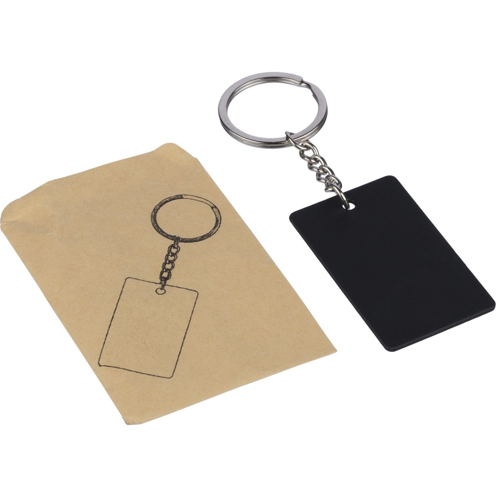 Újrahasznosított rozsdamentes acélból készült, gumírozott felületű, téglalap alakú kulcstartó fém karikával. A kulcstartón gravírozott recycled (újrahasznosított) alapanyagra utaló logó található, amely gravírozás után fényes, tükörszerű hatást mutat. Egyenként kraft papírtasakba csomagolva. Emblémázás: Gravírozás