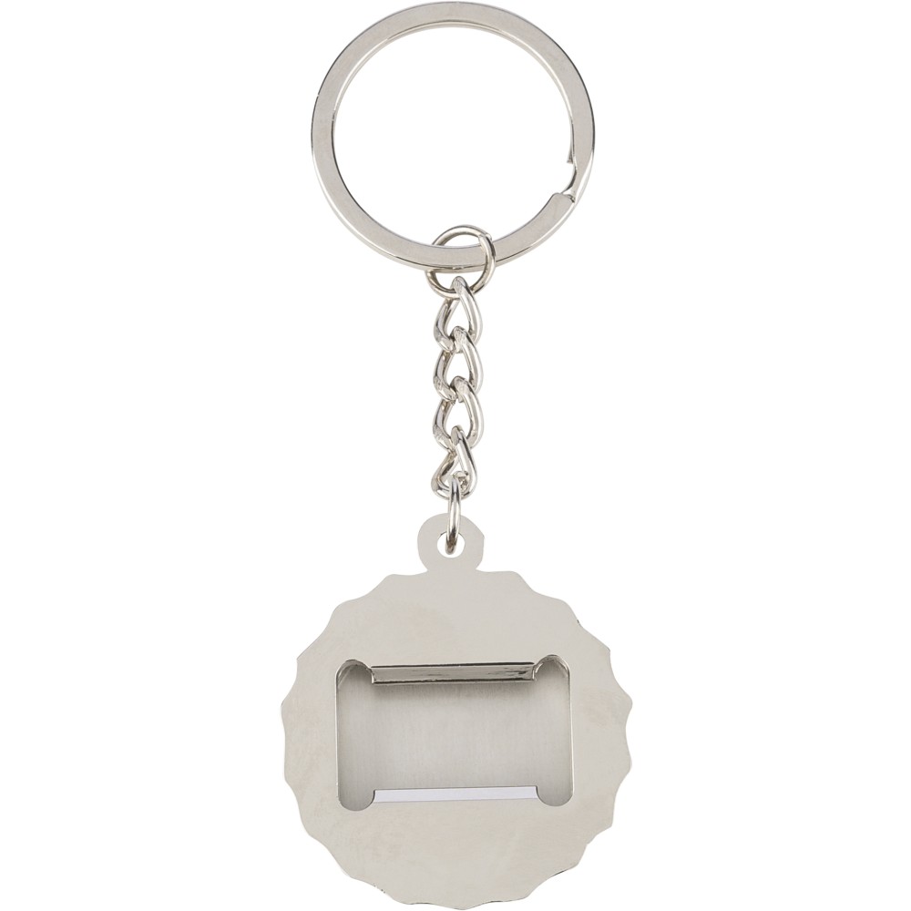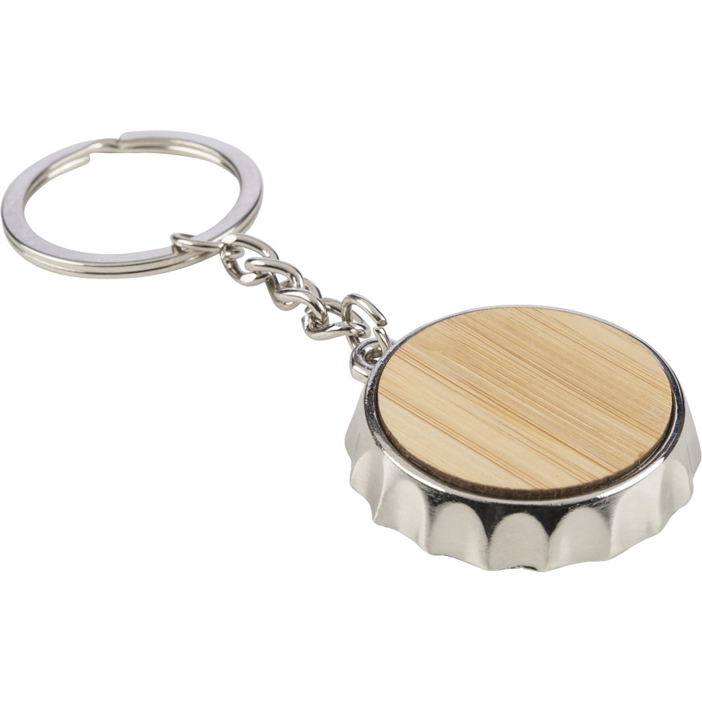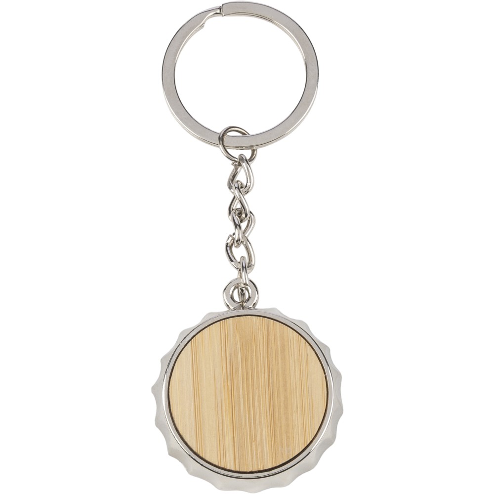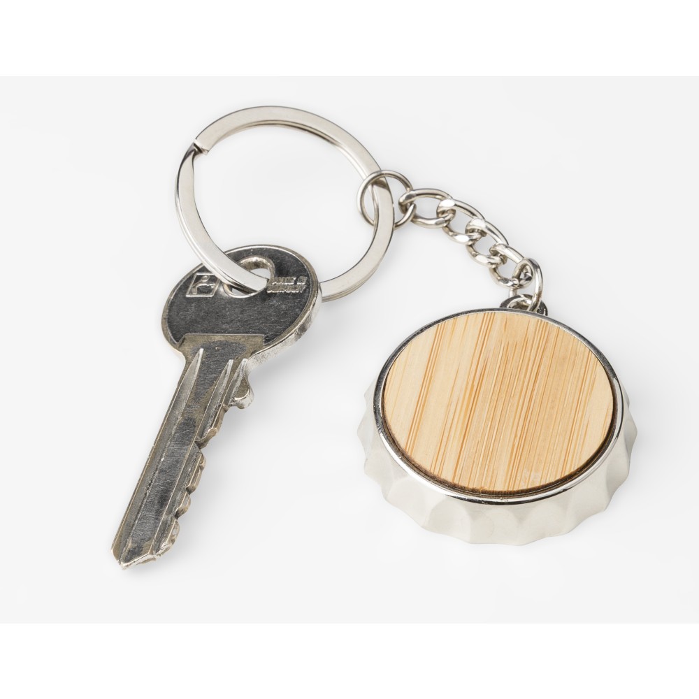 Cinkötvözetből készült kulcstartó elülső oldalán bambusz betéttel, hátoldalán integrált sörnyitó funkcióval, fém kulcskarikával. Papírtasakba csomagolva. Emblémázás: Gravírozás, Tamponnyomás