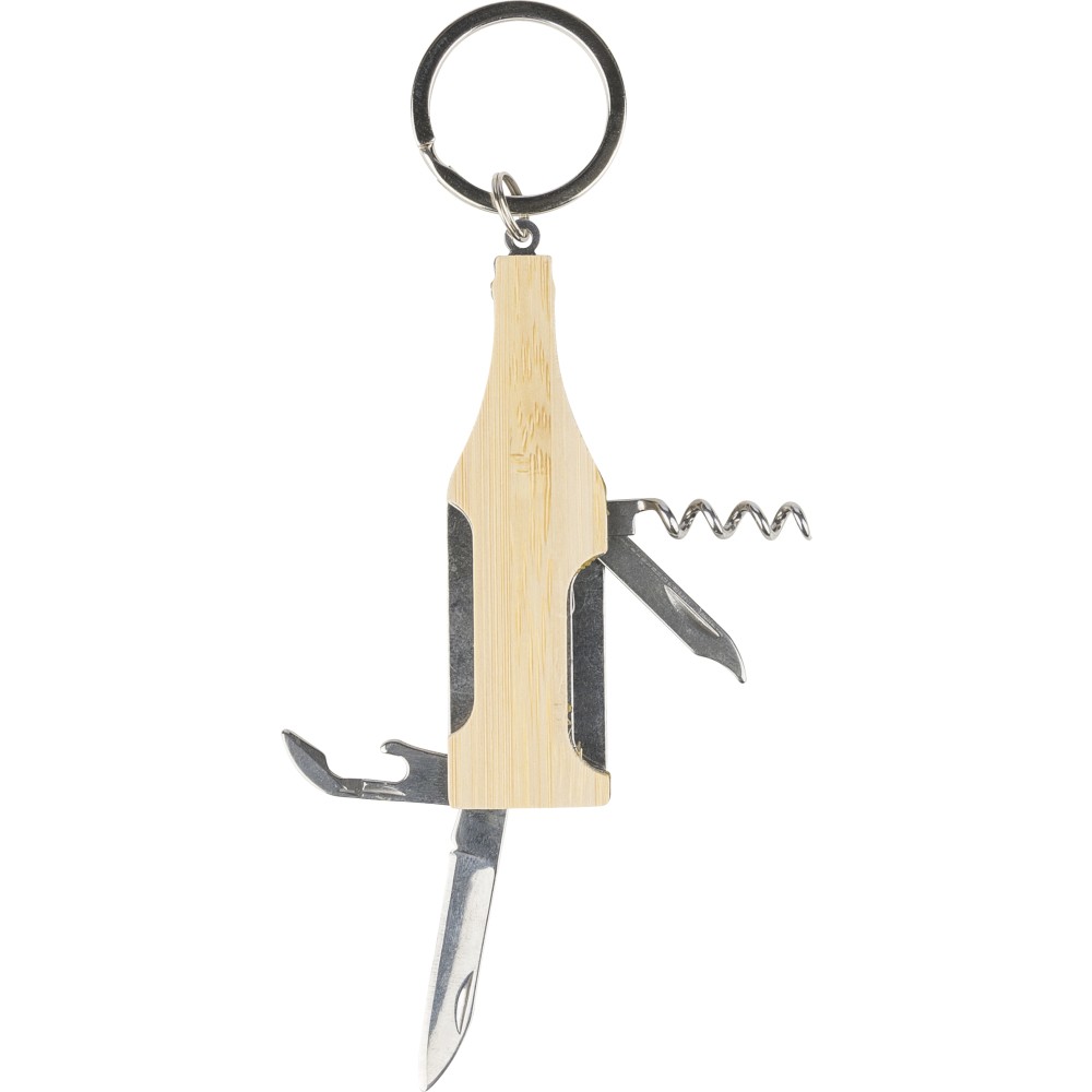 Bambuszból és rozsdamentes acélból készült, palack formájú multifunkciós kulcstartó fém kulcskarikával, dugóhúzóval, körömreszelővel, sörnyitóval és vágókéssel. Egyenként barna kartondobozba csomagolva. Emblémázás: Gravírozás, Tamponnyomás