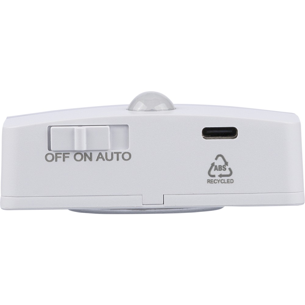 Újrahasznosított ABS és PC anyagból készült érzékelős lámpa 30 lumen fényerővel, 120 fokos mozgásérzékeléssel (3-6 m hatótávolság) és fényérzékelővel. USB-C csatlakozón keresztül újratölthető, 500 mAh kapacitású akkumulátorral. Hátoldalán mágnes, ragasztóval ellátott fémlemez és akasztónyílás található. A töltőcsatlakozó alatt gravírozott recycled (újrahasznosított) alapanyagra utaló logó található. Illusztrációval ellátott barna kartondobozba csomagolva. Emblémázás: Tamponnyomás