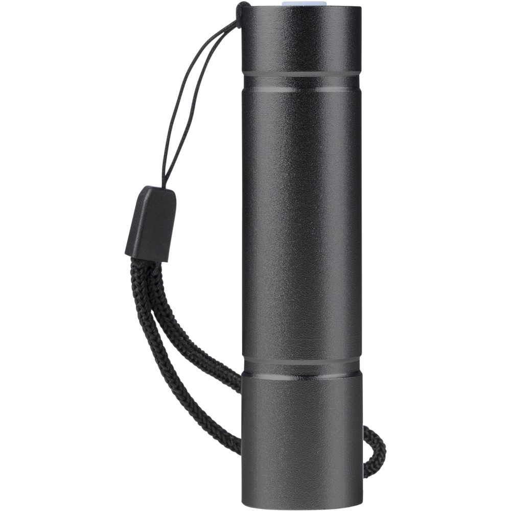Újrahasznosított alumíniumból készült COB zseblámpa (80-100 lumen) 3 világítási móddal, nyomógombbal, csuklópánttal és gravírozott recycled (újrahasznosított) alapanyagra utaló logóval. USB-C-n keresztül újratölthető (300 mAh), a csomag része egy 30 cm-es kábel. Illusztrációval ellátott barna dobozba csomagolva. Emblémázás: Gravírozás, Tamponnyomás