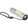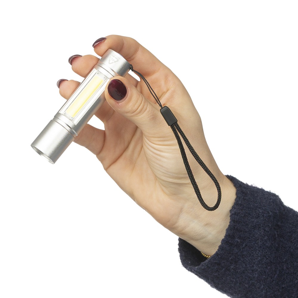 Újrahasznosított alumíniumból készült COB zseblámpa (80-100 lumen) 3 világítási móddal, nyomógombbal, csuklópánttal és gravírozott recycled (újrahasznosított) alapanyagra utaló logóval. USB-C-n keresztül újratölthető (300 mAh), a csomag része egy 30 cm-es kábel. Illusztrációval ellátott barna dobozba csomagolva. Emblémázás: Gravírozás, Tamponnyomás
