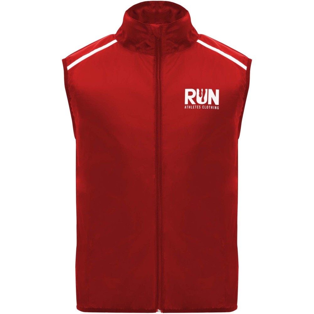 Szélálló és légáteresztő. Elülső cipzár azonos színű állvédővel. Rugalmas szegély a karkivágásnál és az alján. A hát alsó része mikroperforált anyagból készült. Fényvisszaverő csíkok a vállán. Zseb rugalmas pánttal, amelybe a mellényt el lehet csomagolni. Eltávolítható címke. Emblémázás: Szitanyomás