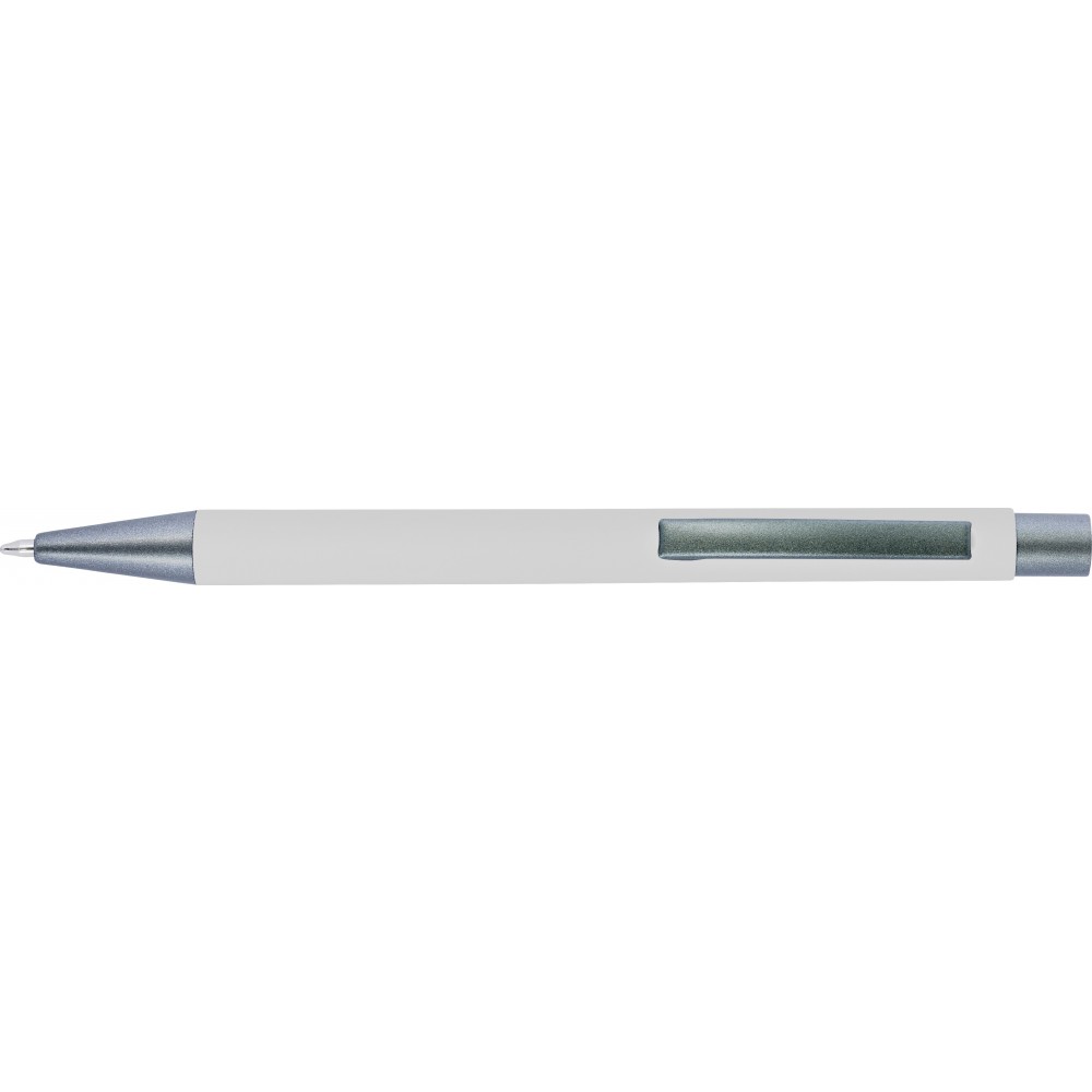 Golyóstoll gumis bevonattal, kék tollbetéttel. A hegy, klipsz és a nyomógomb egyforma sötétszürke színű. ABS, alumínium. Emblémázás: Gravírozás, UV nyomtatás