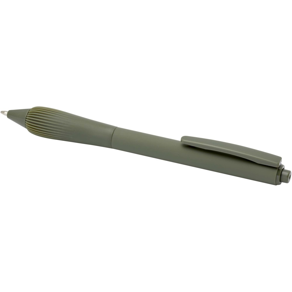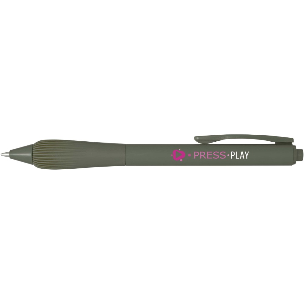 Újrahasznosított műanyag golyóstoll gumírozott tolltesttel és TPR anyagból készült fogórésszel. Kék tollbetéttel. Írási hossz: 1000 méter. Hegyméret: 1,0 mm. Emblémázás: Tamponnyomás
