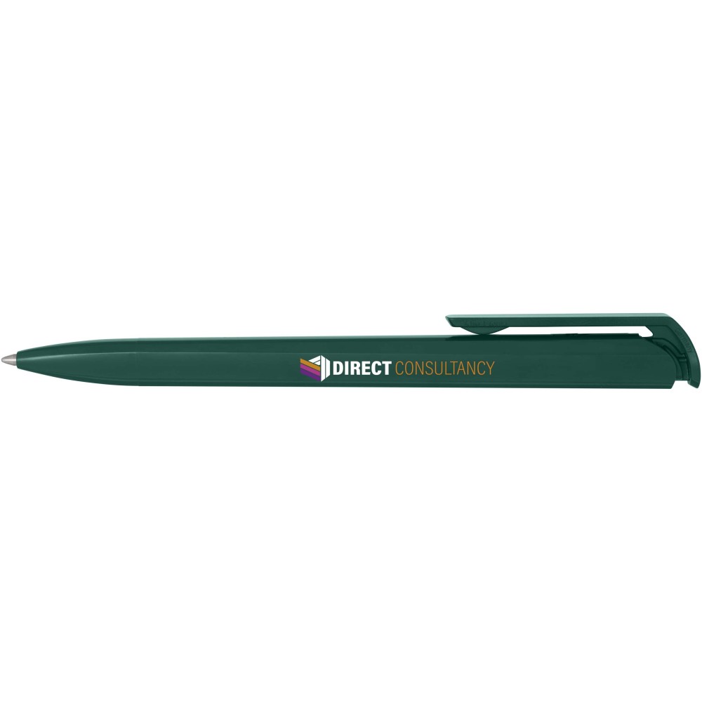 Golyóstoll, amelynek teste és klipsze újrahasznosított műanyagból készült, a hegy pedig rozsdamentes acélból. Fekete tollbetéttel. Íráshossz: 3000 méter. Hegyméret: 1,00 mm. Németországban készült. Emblémázás: Tamponnyomás