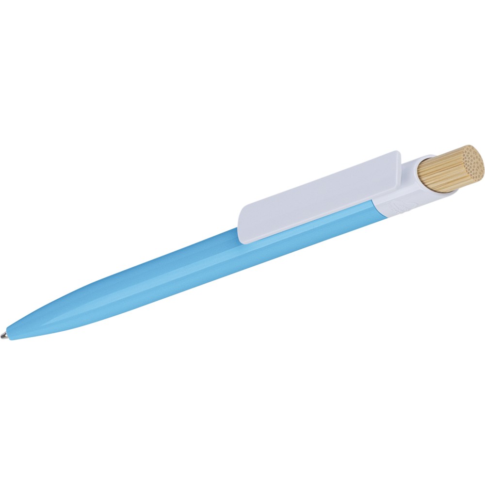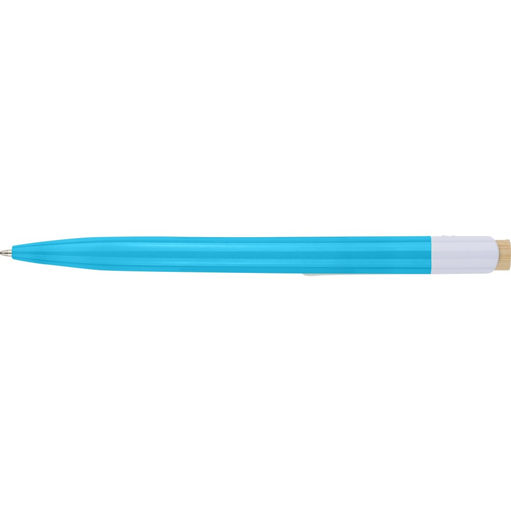 Újrahasznosított ABS-ből készült golyóstoll bambusz nyomógombbal és fehér klippel, digitális nyomtatásra alkalmas kivitelben. A tolltesten fröccsöntés során elhelyezett recycled (újrahasznosított) alapanyagra utaló logó található. Megközelítőleg 600 méter íráshosszúságú, kék színű tollbetéttel. Emblémázás: Tamponnyomás