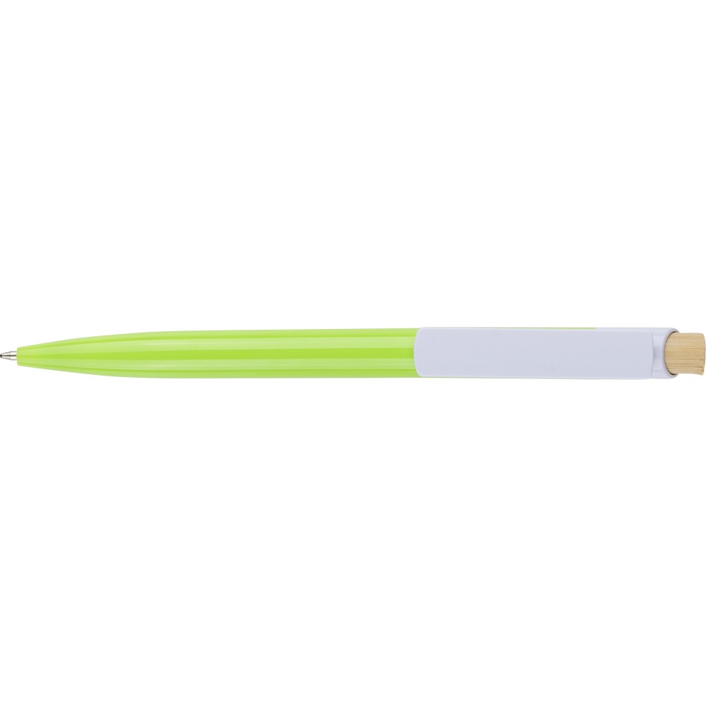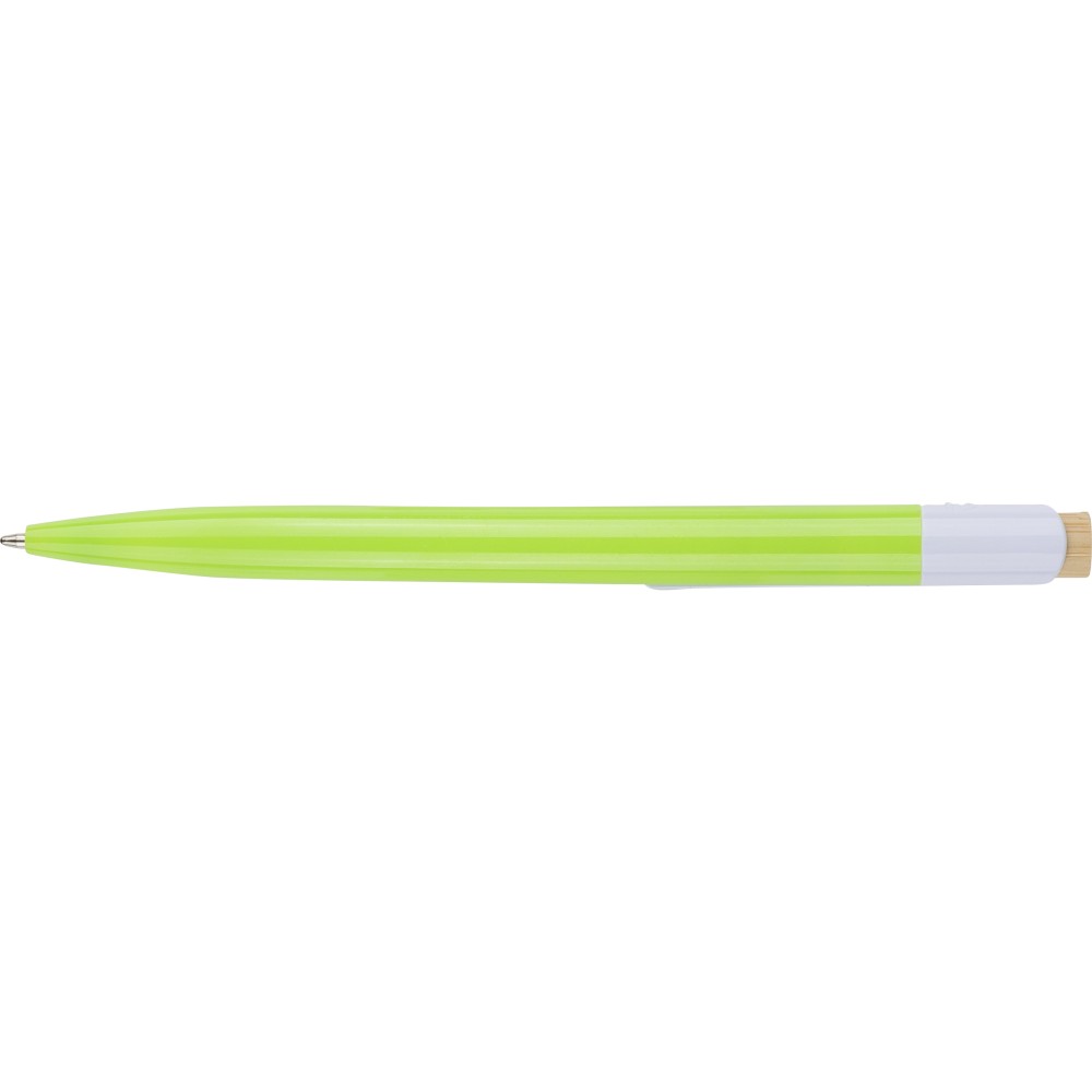 Újrahasznosított ABS-ből készült golyóstoll bambusz nyomógombbal és fehér klippel, digitális nyomtatásra alkalmas kivitelben. A tolltesten fröccsöntés során elhelyezett recycled (újrahasznosított) alapanyagra utaló logó található. Megközelítőleg 600 méter íráshosszúságú, kék színű tollbetéttel. Emblémázás: Tamponnyomás