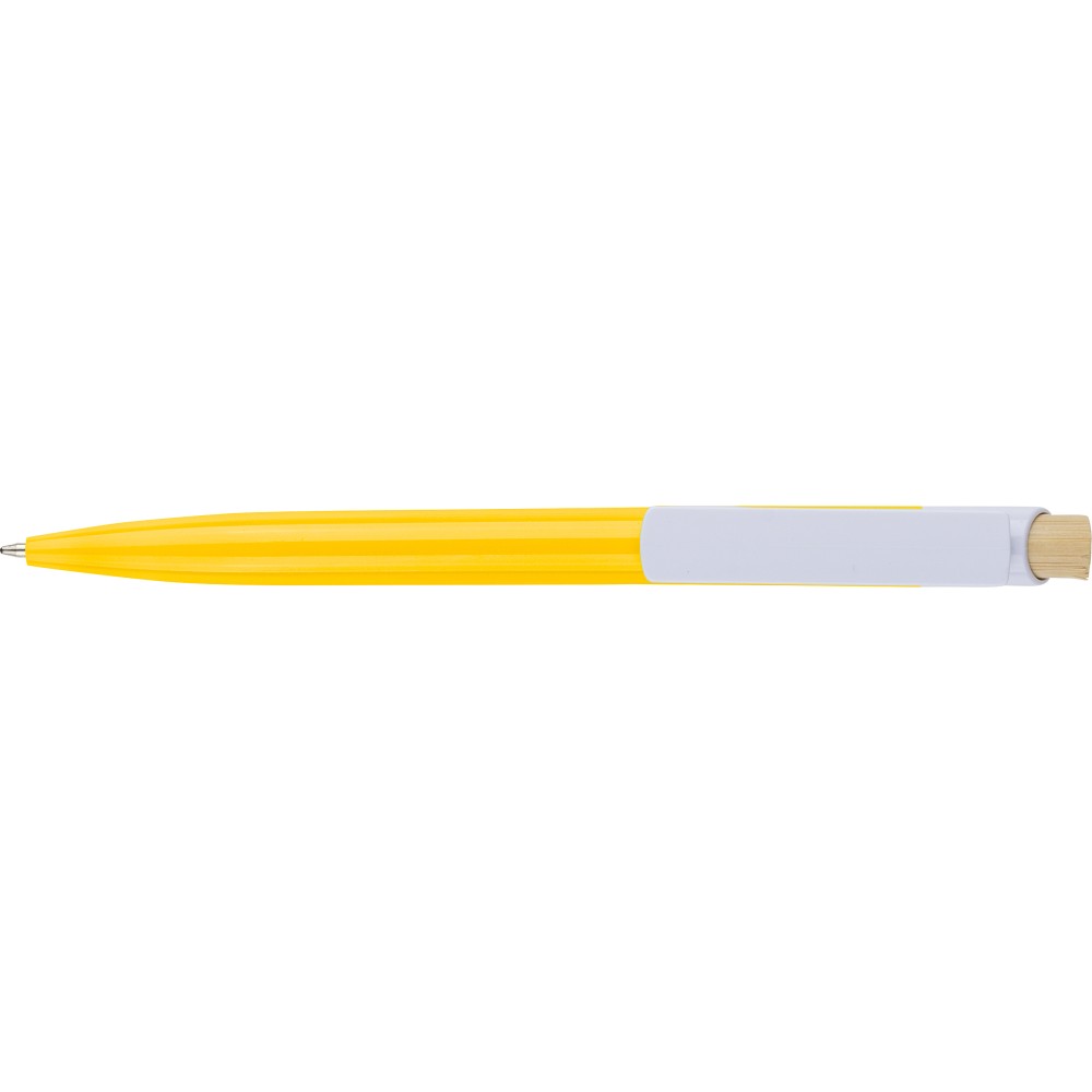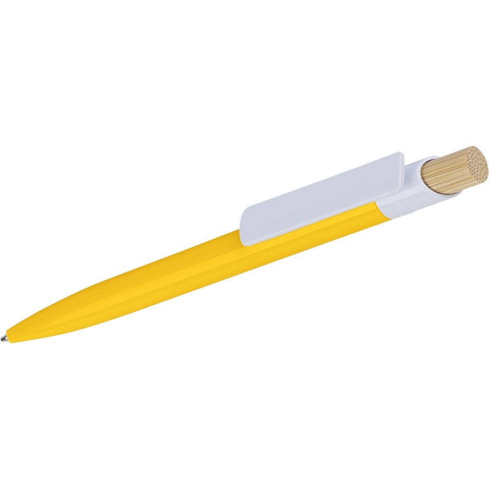 Újrahasznosított ABS-ből készült golyóstoll bambusz nyomógombbal és fehér klippel, digitális nyomtatásra alkalmas kivitelben. A tolltesten fröccsöntés során elhelyezett recycled (újrahasznosított) alapanyagra utaló logó található. Megközelítőleg 600 méter íráshosszúságú, kék színű tollbetéttel. Emblémázás: Tamponnyomás