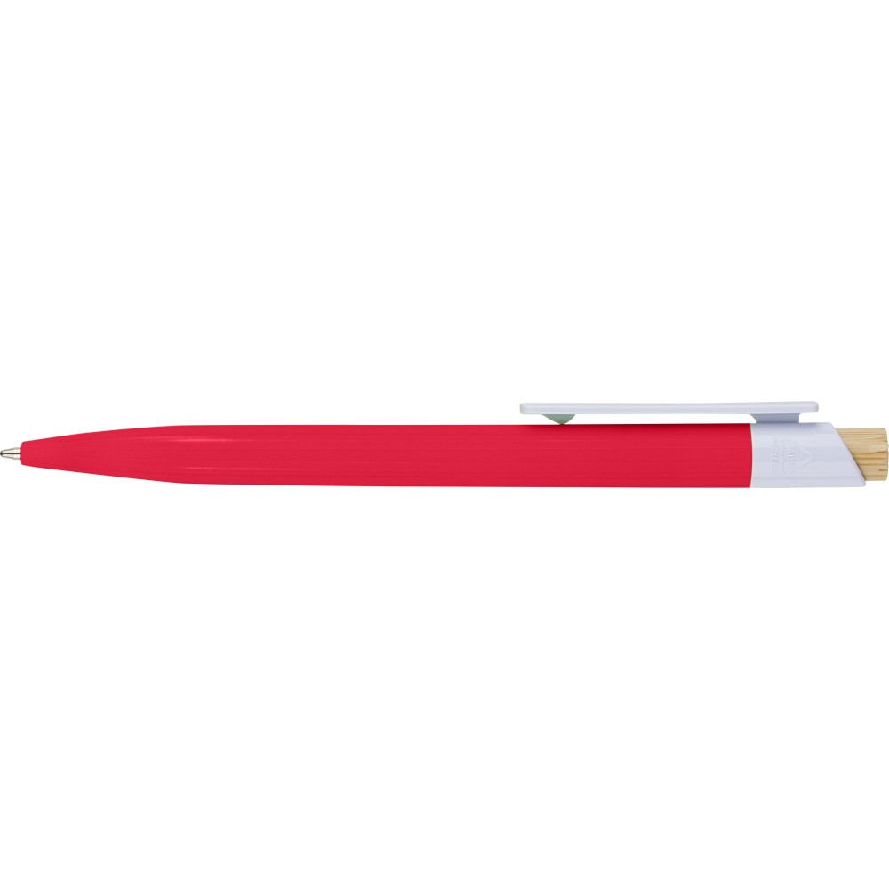 Újrahasznosított ABS-ből készült golyóstoll bambusz nyomógombbal és fehér klippel, digitális nyomtatásra alkalmas kivitelben. A tolltesten fröccsöntés során elhelyezett recycled (újrahasznosított) alapanyagra utaló logó található. Megközelítőleg 600 méter íráshosszúságú, kék színű tollbetéttel. Emblémázás: Tamponnyomás
