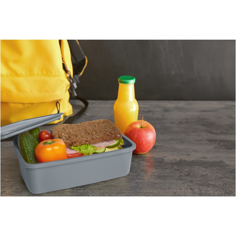 A 800 ml-es Dovi ebéddoboz 100%-ban újrahasznosított műanyagból készült, így fenntartható és trendi választás. Elasztikus szalaggal záródik, amely biztonságosan a helyén tartja a fedelet útközben. Emblémázás: UV nyomtatás
