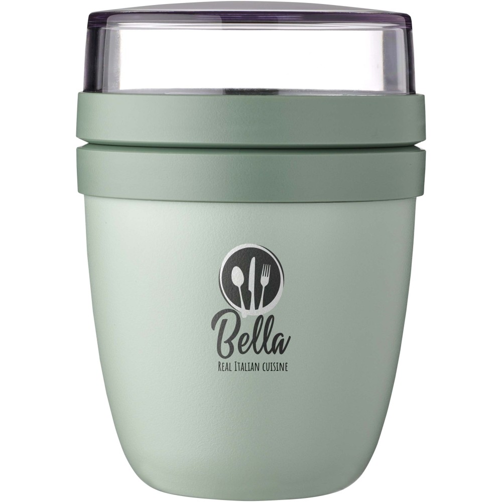 Az Ellipse Mini ételdoboz tökéletes különféle snackekhez, például joghurthoz müzlivel vagy leveshez krutonnal. Két praktikus rekesszel rendelkezik egy strapabíró tartályban, így az összetevőket szépen elkülönítheti egymástól. Kompakt mérete miatt ideális iskolatáskába való elhelyezésre, így gyors és kényelmes étkezést biztosít. A felső átlátszó tartály 120 ml-es, ideális körülbelül 50 gramm müzli vagy gyümölcs tárolására, az alsó tartály pedig 300 ml-es. Szivárgásmentes és mosogatógépben mosható. BPA-mentes. Emblémázás: Tamponnyomás