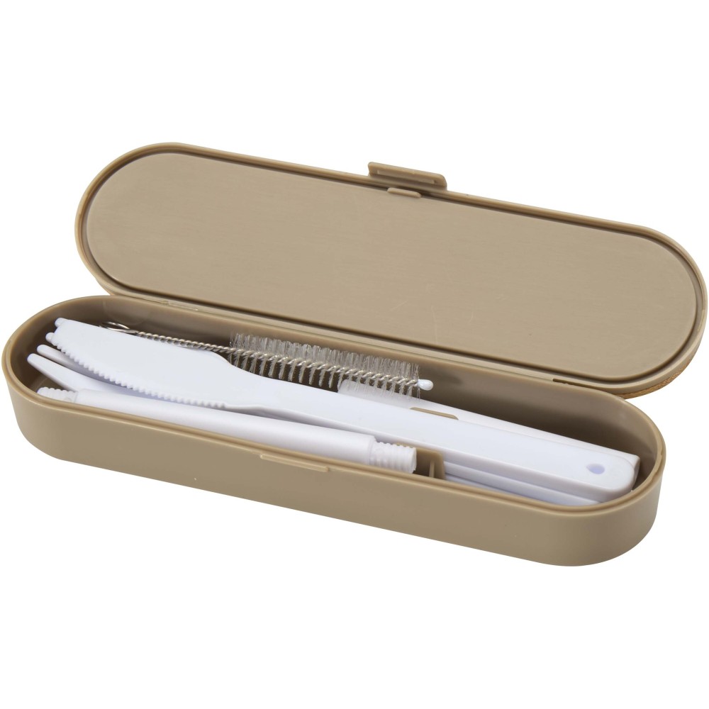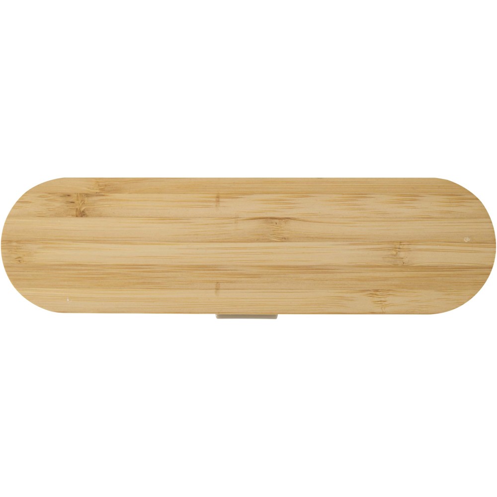 Újrafelhasználható evőeszközkészlet bambusz fedéllel, amely tartalmaz egy villát, kést, kanalat, szívószálat és egy szívószál tisztító kefét - ideális megoldást kínál az útközbeni étkezésekhez. Kompakt kialakításának és egyszerű tisztíthatóságának köszönhetően tökéletes kiegészítő uzsonnás dobozok mellé, utazáshoz vagy irodai használatra. Emblémázás: Gravírozás, Tamponnyomás, UV nyomtatás