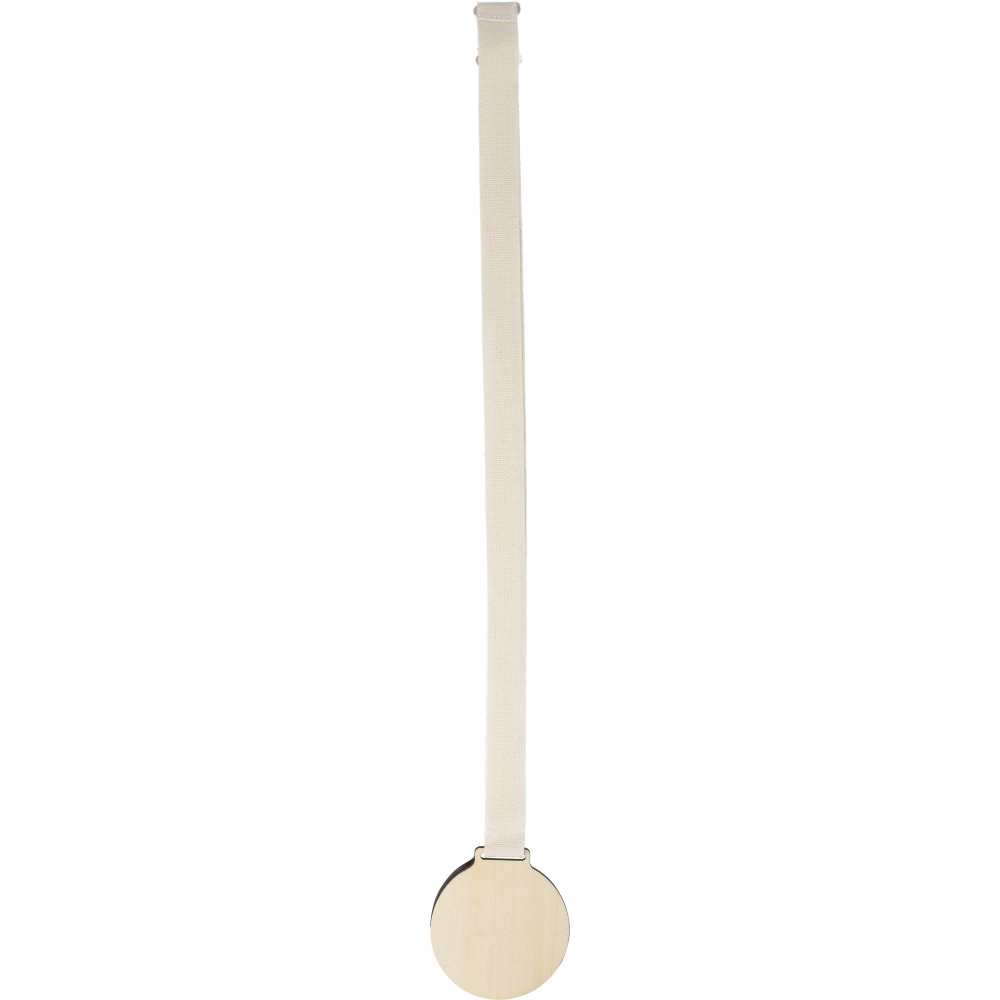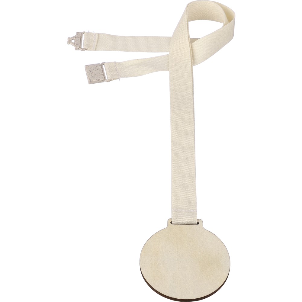 7 cm átmérőjű és 4 mm vastagságú hársfa medál 90 x 2 cm-es pamut nyakpánttal és környezetbarát búzaszalma-PP keverék biztonsági csattal a kényelem érdekében. Emblémázás: Gravírozás, Tamponnyomás