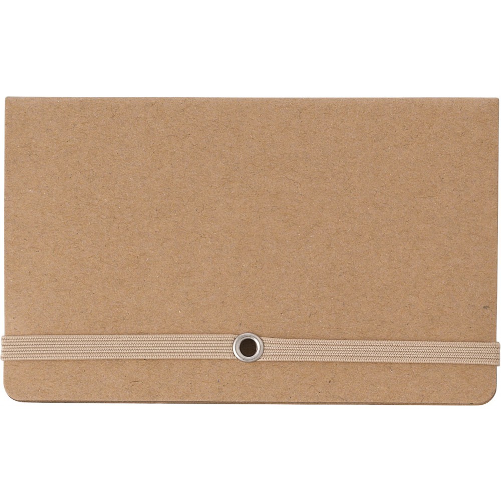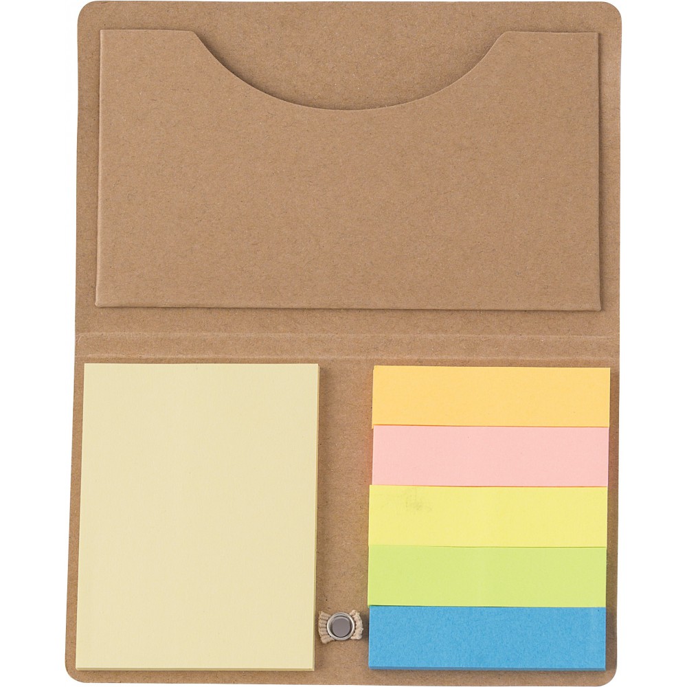Jegyzettömbkészlet. Karton tartó összefogó pánttal, mely 150 öntapadó jegyzetlapot, valamint névjegyek tárolására alkalmas zsebet tartalmaz. Emblémázás: Szitanyomás, Tamponnyomás