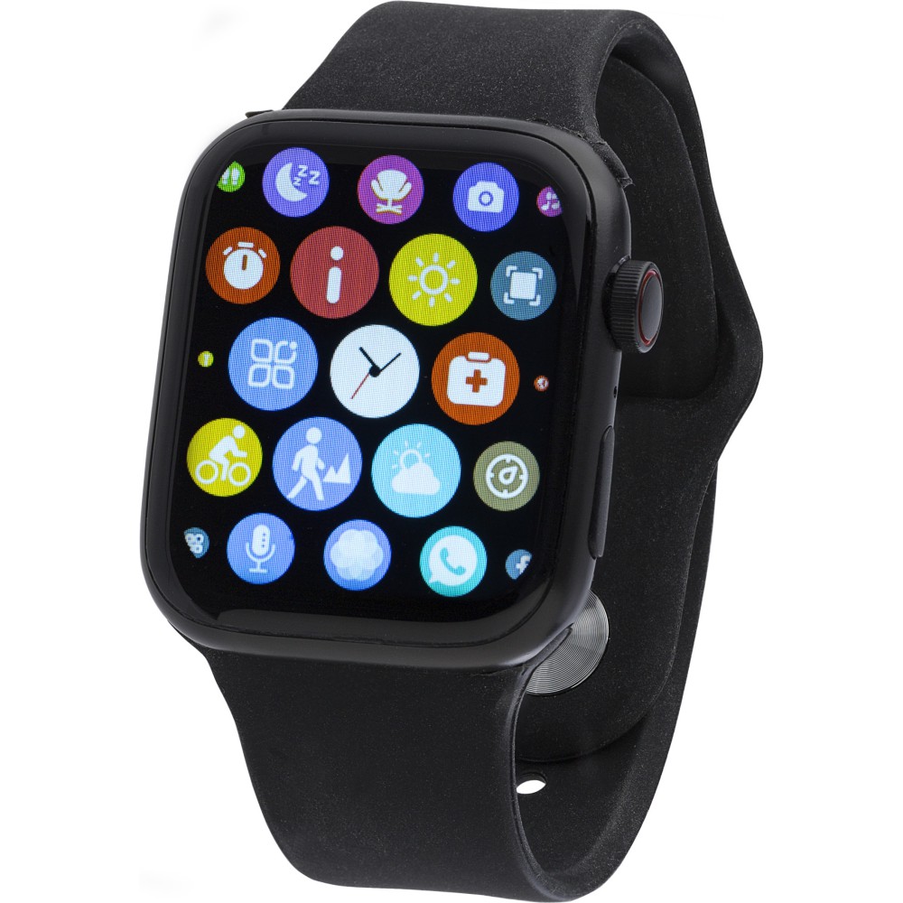 PC és PVC okosóra állítható karpánttal és vezeték nélküli technológiával. Érintőképernyővel és görgető gombbal az oldalán. Funkciók: telefonhívás, szívritmus, alvásfigyelő, oxigénmérés, üzenet emlékeztető, ivás emlékeztető, edzés emlékeztető. USB kábellel együtt. Android és iOS rendszerrel is kompatibilis. Egyenként csomagolva kartondobozban. Emblémázás: Gravírozás, Matricázás
