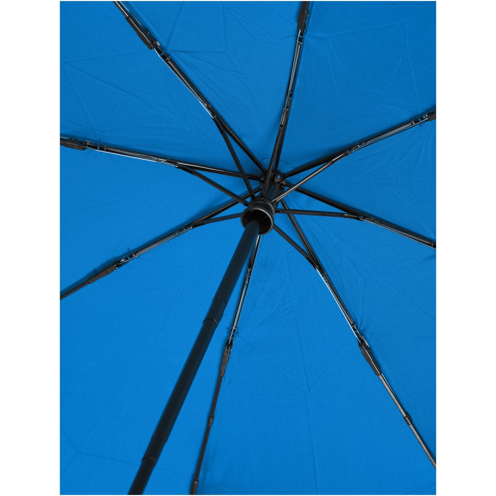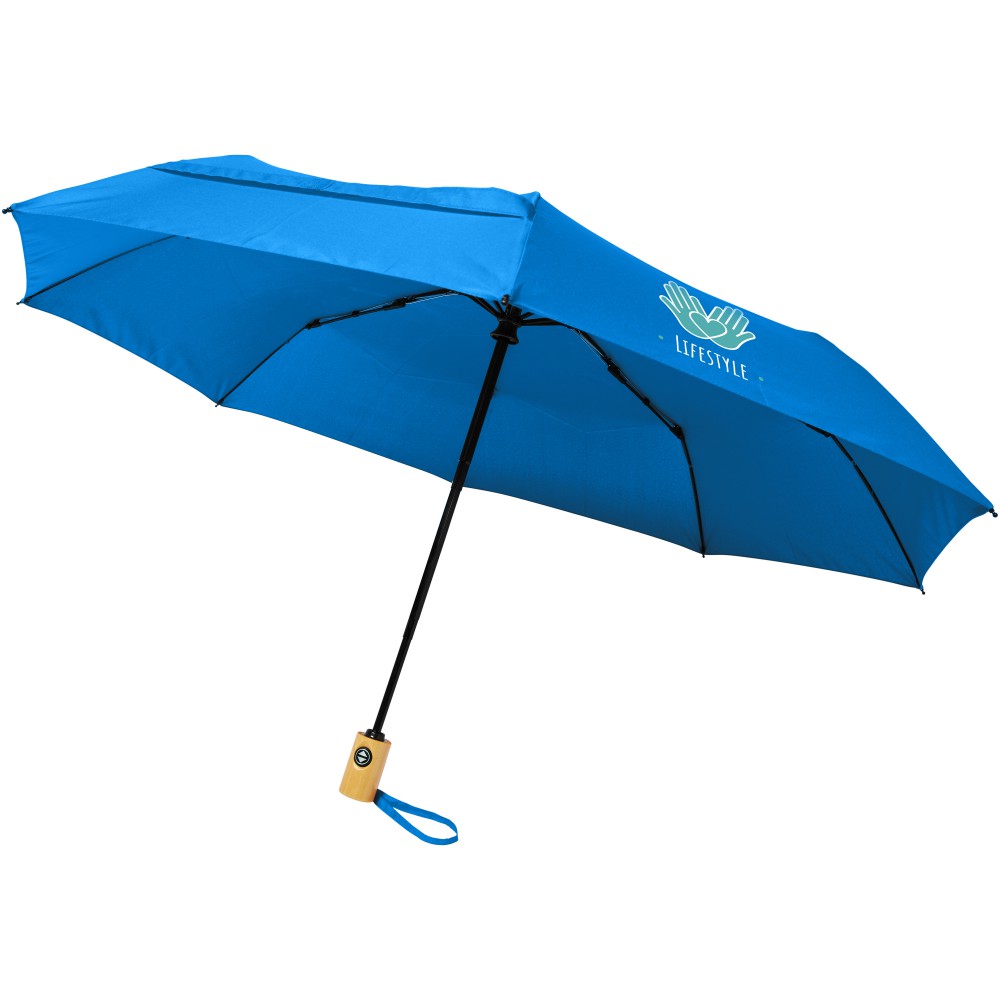 Összecsukható 21 -es esernyő. Erős fém váz, üvegszálas szerkezet. Fa nyele és az újrahasznosított RPET alapanyag miatt jó választás azok számára, akiknek fontos a fenntartható szemlélet. Emblémázás: Szitanyomás