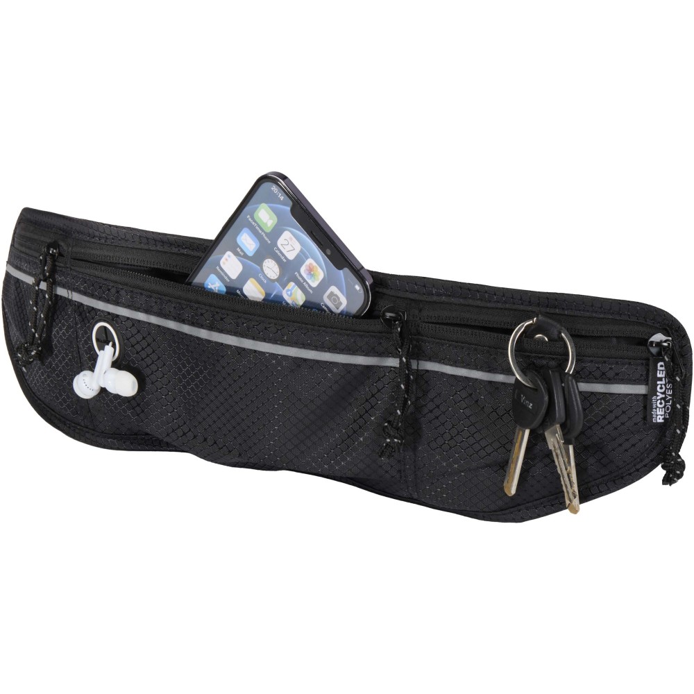 A Nomad övtáska futáshoz - GRS tanúsítvánnyal rendelkező, újrahasznosított ripstop anyagból készült, vízlepergető felülettel, GRS tanúsítvánnyal rendelkező RPET béléssel és fényvisszaverő elemekkel. Kompakt és könnyű megoldás futáshoz, túrázáshoz vagy más szabadtéri tevékenységekhez. Három cipzáras zsebbel rendelkezik, hogy a telefon, fülhallgató, kulcsok és egyéb tárgyak rendezetten és elkülönítve legyenek tárolhatók. A fényvisszaverő részletek növelik a láthatóságot kora reggeli vagy esti használat során. Hátoldala könnyű, nedvességelvezető hálóból készült, amely fokozza a szellőzést és csökkenti az izzadság felgyülemlését. Az állítható, rugalmas derékpánt biztosítja a stabil és kényelmes illeszkedést mozgás közben. Emblémázás: Szitanyomás