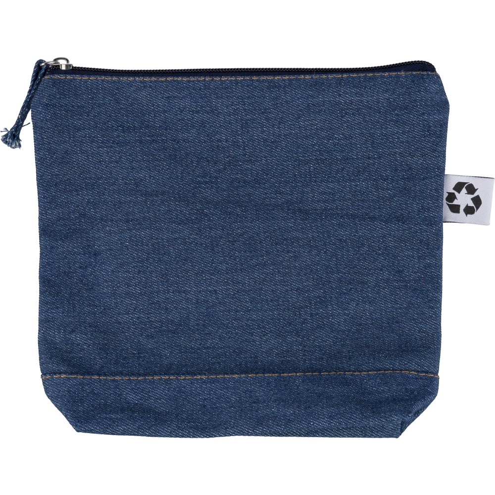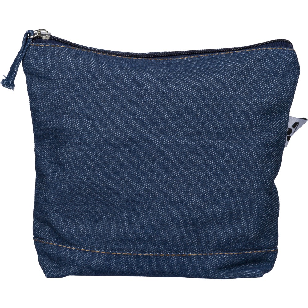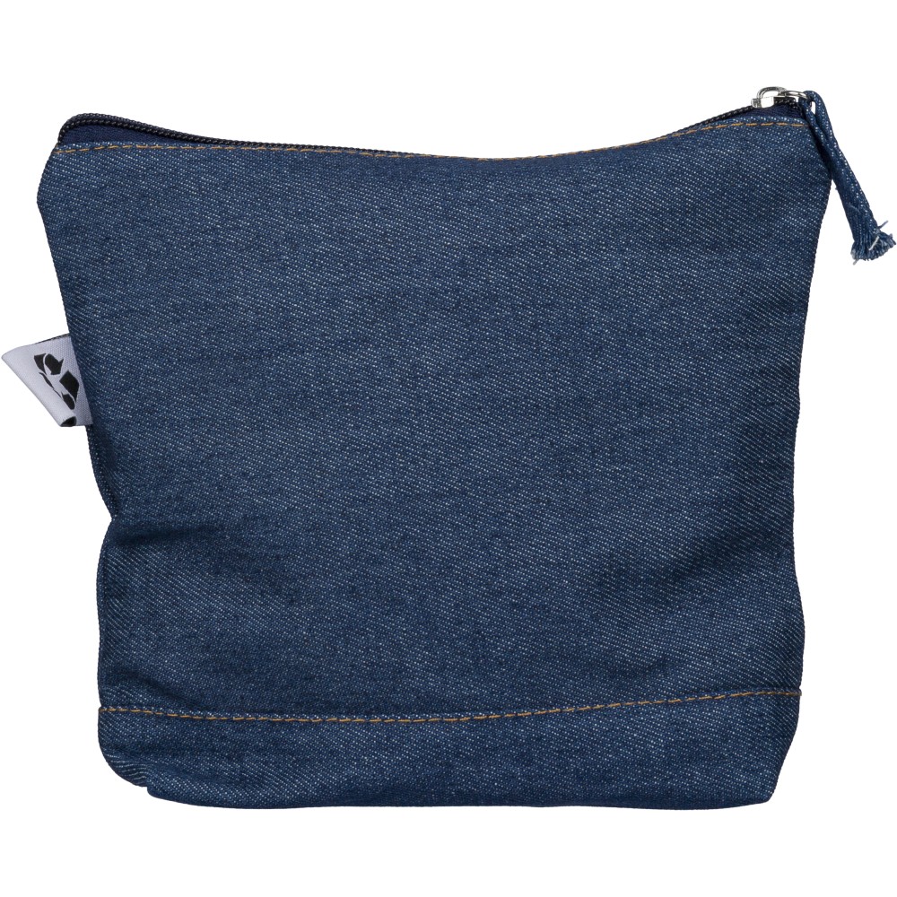 Újrahasznosított farmeranyagból készült kozmetikai táska 21 × 18,5 cm méretben, egy cipzáras fő rekesszel és a külső felületen elhelyezett újrahasznosított alapanyagra utaló címkével. Emblémázás: Szitanyomás