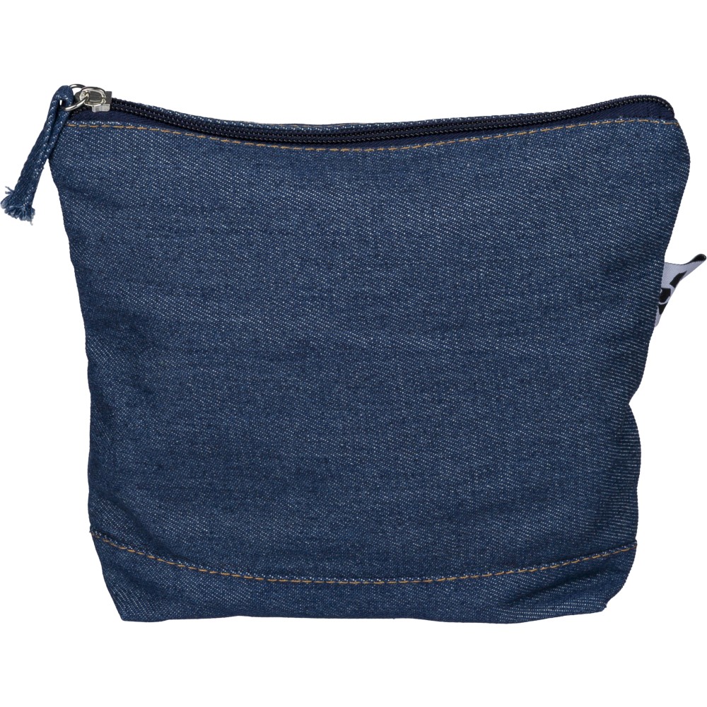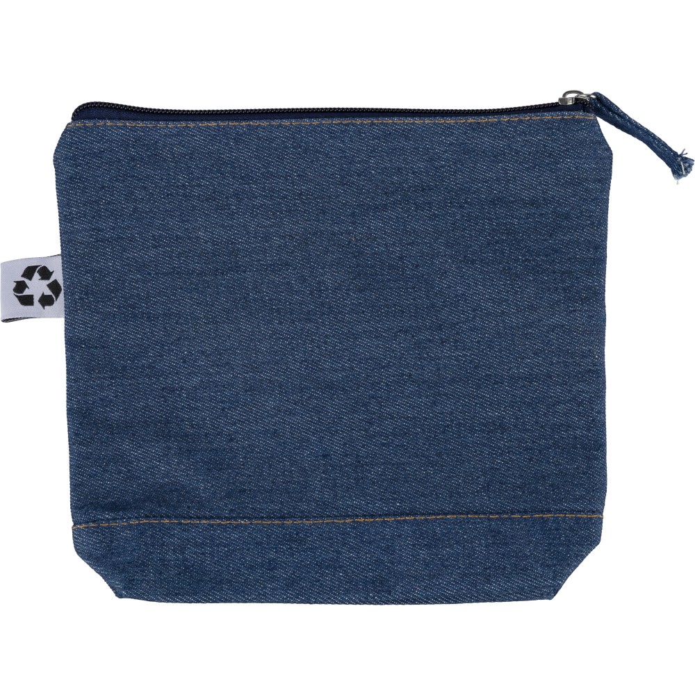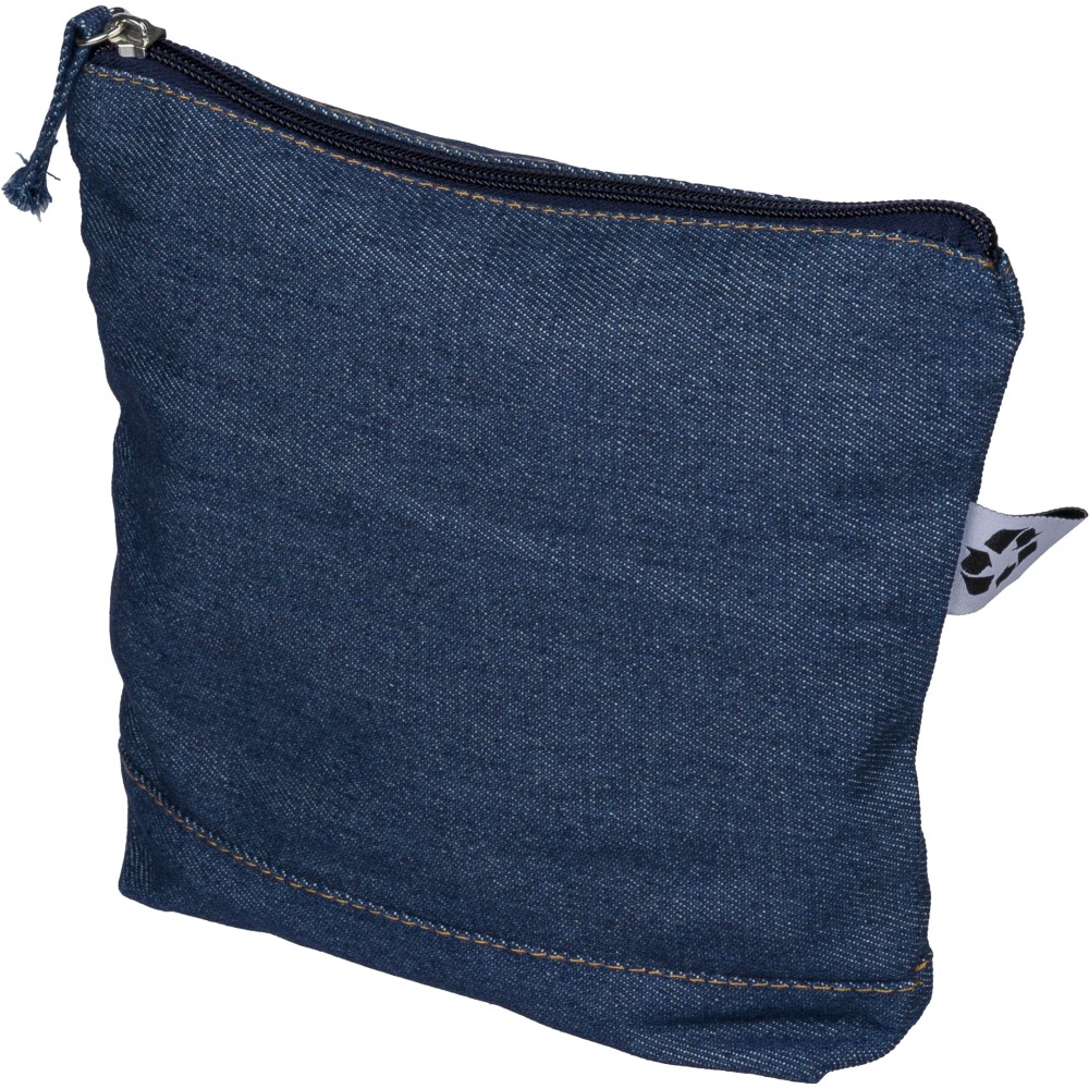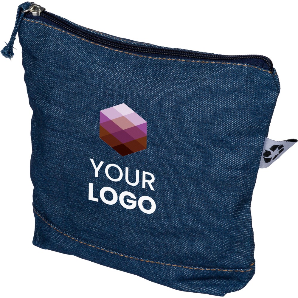 Újrahasznosított farmeranyagból készült kozmetikai táska 21 × 18,5 cm méretben, egy cipzáras fő rekesszel és a külső felületen elhelyezett újrahasznosított alapanyagra utaló címkével. Emblémázás: Szitanyomás