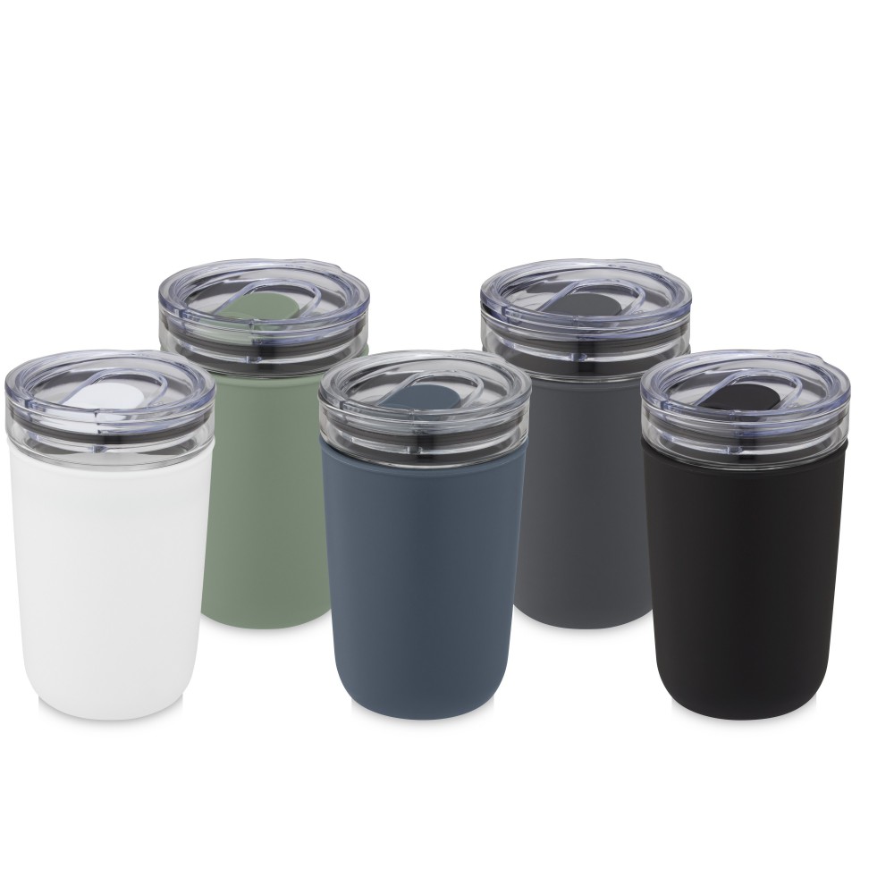 Újrahasznosított műanyag tokkal védett üvegpohár. A pohár 100%-ban tartós boroszilikát üvegből készült, amely megőrzi az ital frissességét, és nem tartalmaz semmilyen káros vegyszert. BPA-mentes, a német élelmiszerbiztonsági törvény (LFGB) szerint tesztelt és jóváhagyott. Ftaláttartalomra tesztelve és jóváhagyva a REACH előírásai szerint. A pohár a legtöbb kávéfőző alá illeszkedik. Nem szivárgásmentes. Szénsavas italokkal nem használható. Mosogatógépben mosható, de mikrohullámú sütőben történő melegítésre nem alkalmas. Űrtartalom: 420 ml. Újrahasznosított karton díszdobozban. Emblémázás: Bögredekor, Tamponnyomás
