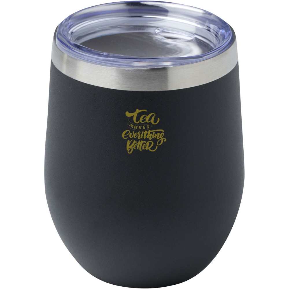 A Corzo RCS tanúsítvánnyal rendelkező rozsdamentes acélból készült, és duplafalú vákuum konstrukcióval rendelkezik réz szigeteléssel, amely 6 órán keresztül melegen, vagy 24 órán keresztül hidegen tartja az italokat. A konstrukció megakadályozza a kondenzációt a csésze külsején. Könnyen használható, nyomófedeles kialakítás. Az alsó részén porfestett bevonat található. Széles nyílás a kényelmes töltéshez és öntéshez. Űrtartalom: 350 ml. Újrahasznosított kartondobozban szállítjuk. Emblémázás: Gravírozás, Tamponnyomás