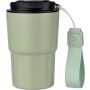 Rozsdamentes acél, porszórt felületű duplafalú bögre (320 ml). Rozsdamentes acél, belül 304-es és kívül 201-es. Oldalán hordozópánttal, PP fedéllel. Emblémázás: Gravírozás, Tamponnyomás