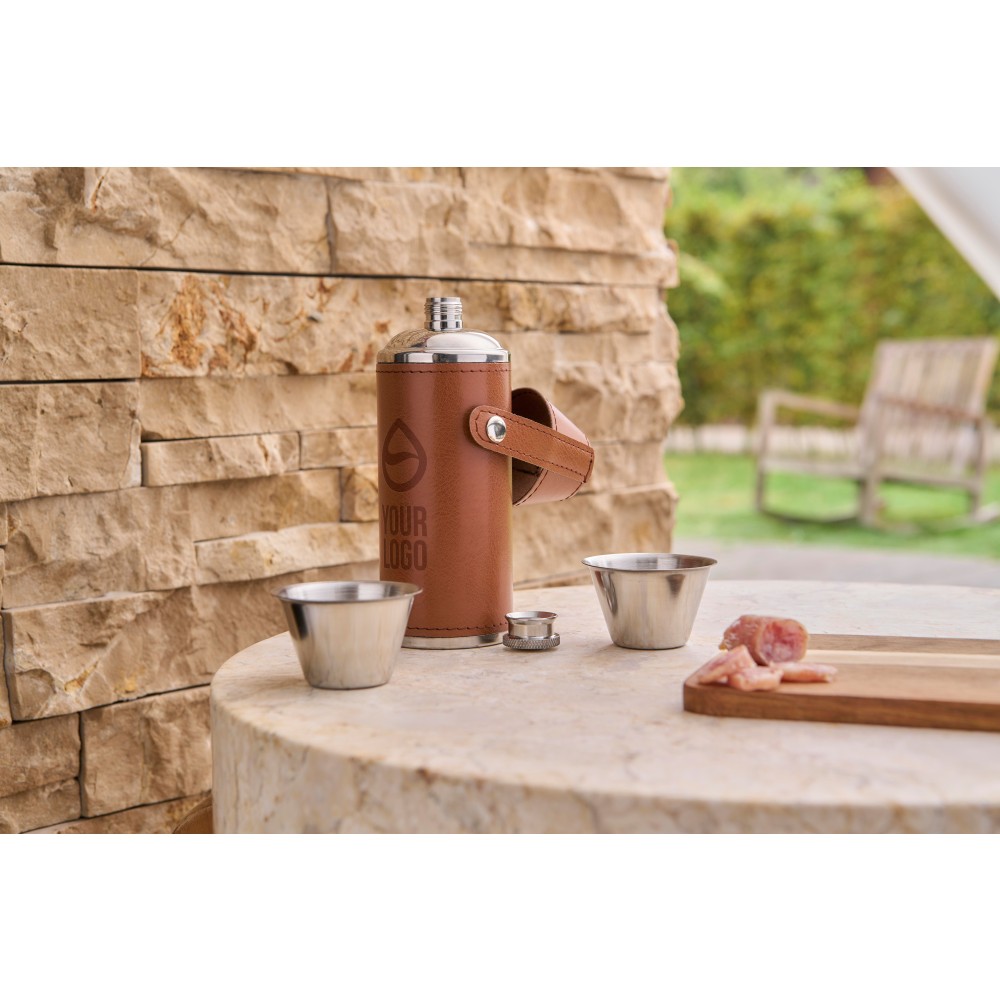 Kulacs két kupicával (40 ml) és külső PU borítással. 304-es rozsdamentes acélból készült. A poharak a tetején patenttal rögzíthetők. Egyenként barna kartondobozba csomagolva. Anyaga: újrahasznosított rozsdamentes acél. Űrtartalom: 230 ml. Emblémázás: Gravírozás