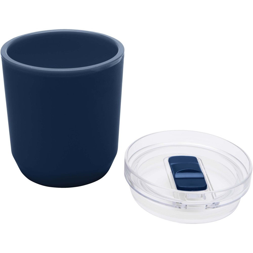 Egyszerű kialakítású termoszbögre, amely a legtöbb kávégéppel és autós pohártartóval kompatibilis. Dupla falú szerkezettel rendelkezik, újrahasznosított PP műanyag külsővel és PP műanyag belsővel. A csúsztatható fedél AS és PP műanyagból készült. Űrtartalma: 180 ml. Emblémázás: Körszita, Tamponnyomás