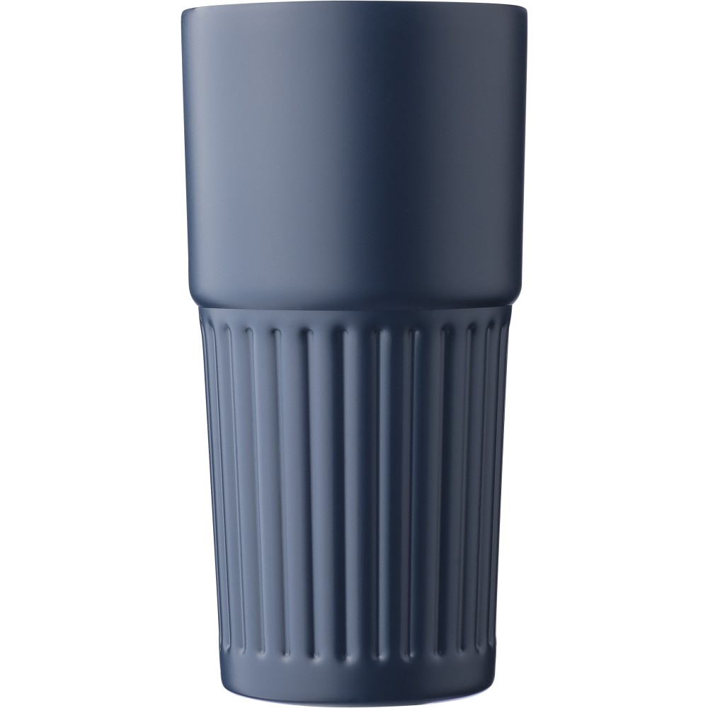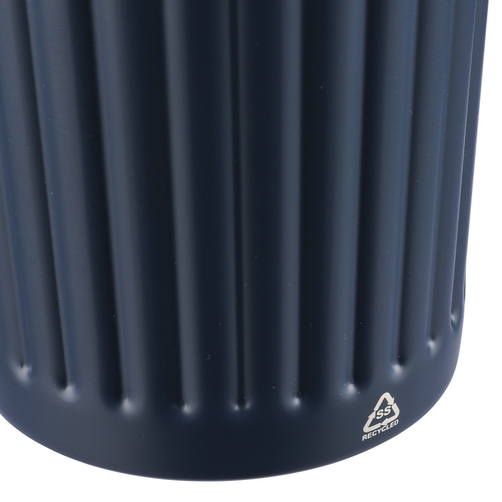 Újrahasznosított rozsdamentes acél útibögre, 450 ml. A belső 304-es, a külső 201-es rozsdamentes acélból készült, bordás markolattal, műanyag, csúszózáras fedéllel. Gravírozott újrahasznosított logó található a bögrén. Csomagolása barna papírdoboz. Emblémázás: Körszita, Tamponnyomás