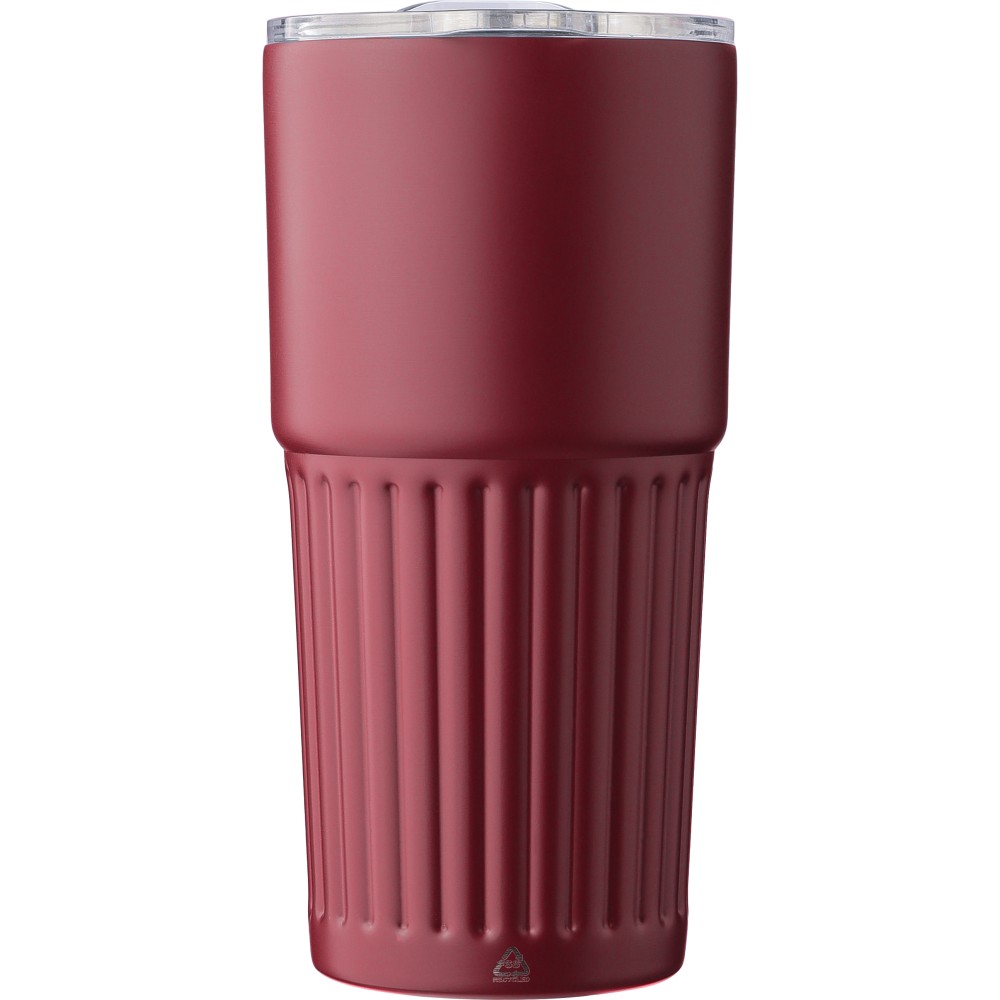 Újrahasznosított rozsdamentes acélból készült, duplafalú ivópohár (500 ml). Belső része 304-es, külső része 201-es rozsdamentes acél, bordázott fogófelülettel. AS fedéllel rendelkezik csúsztatható zárással. A palacktesten gravírozott recycled (újrahasznosított) alapanyagra utaló logó található. Darabonként barna kartondobozba csomagolva. Emblémázás: Körszita, Tamponnyomás