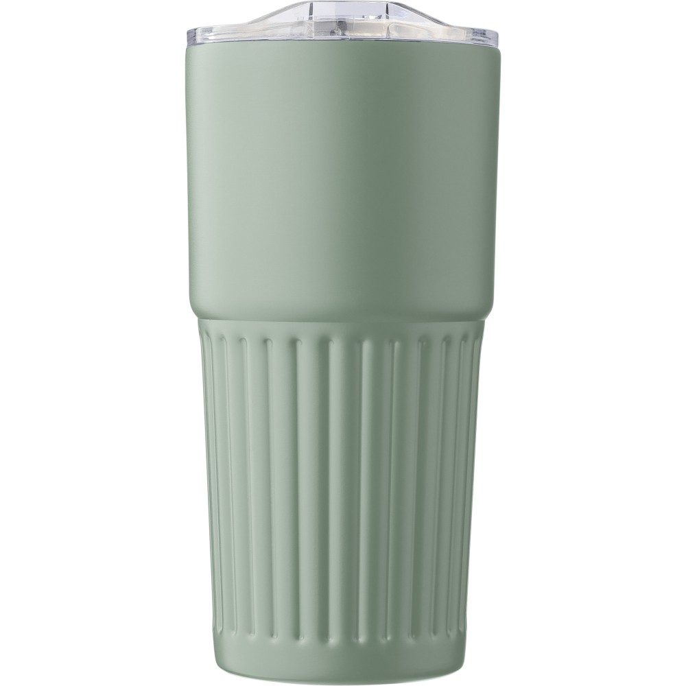 Újrahasznosított rozsdamentes acélból készült, duplafalú ivópohár (500 ml). Belső része 304-es, külső része 201-es rozsdamentes acél, bordázott fogófelülettel. AS fedéllel rendelkezik csúsztatható zárással. A palacktesten gravírozott recycled (újrahasznosított) alapanyagra utaló logó található. Darabonként barna kartondobozba csomagolva. Emblémázás: Körszita, Tamponnyomás