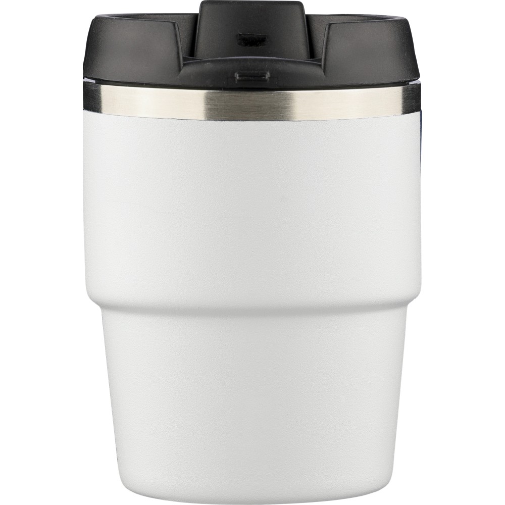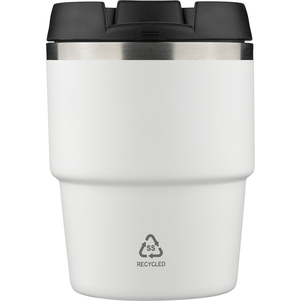 Újrahasznosított rozsdamentes acélból készült, vákuumszigetelésű bögre (175 ml) duplafalú kialakítással és porfestett felülettel, PP csavaros fedéllel. A pohártesten lézergravírozott recycled (újrahasznosított) alapanyagra utaló logó található. Kompakt kialakítása miatt a legtöbb kávégépbe illeszkedik, darabonként barna kartondobozba csomagolva szállítjuk. Emblémázás: Bögredekor