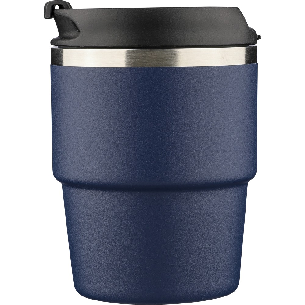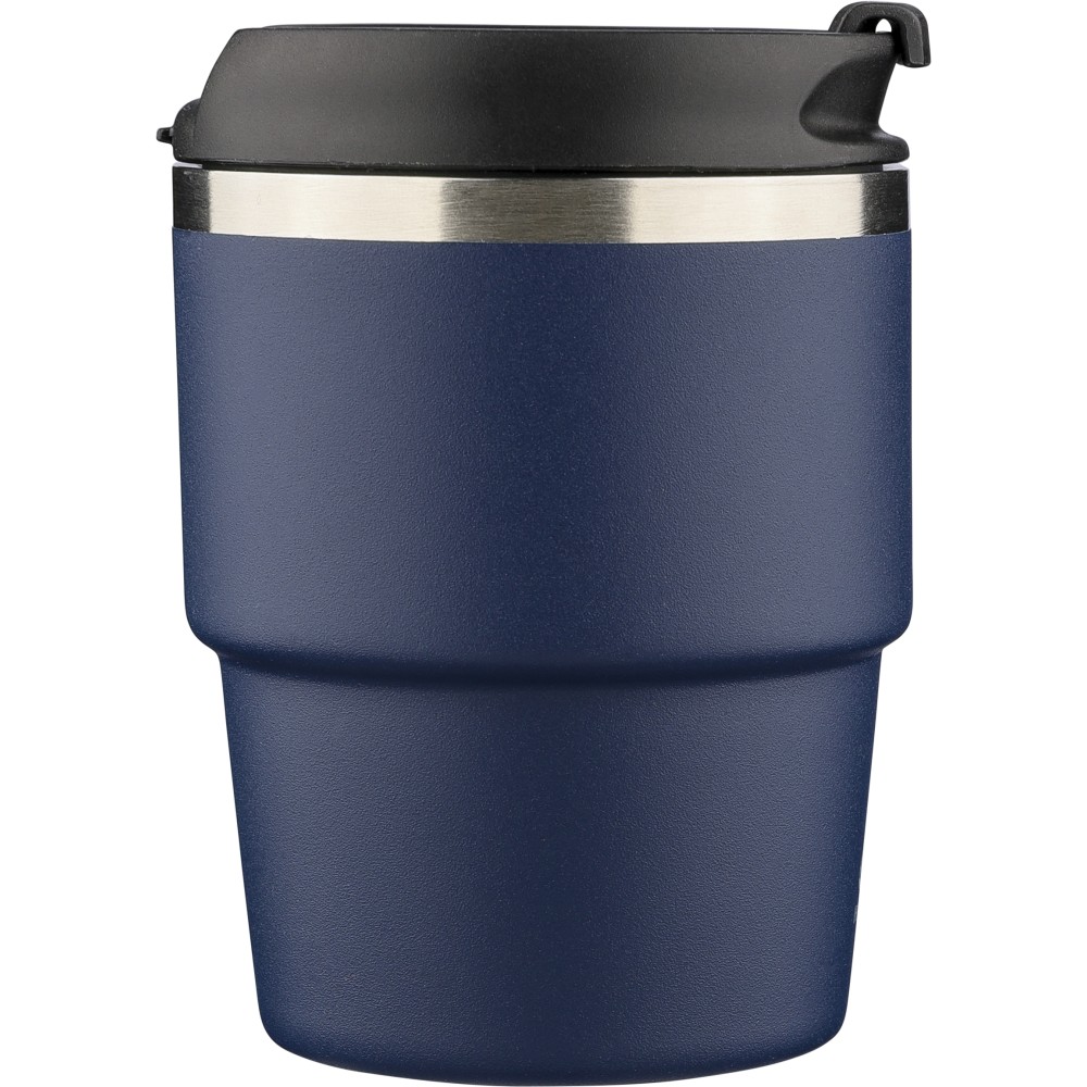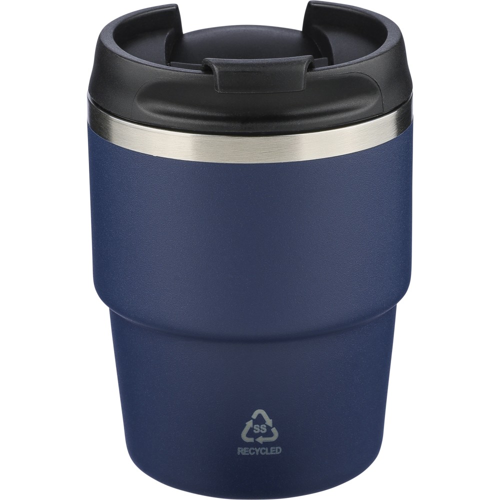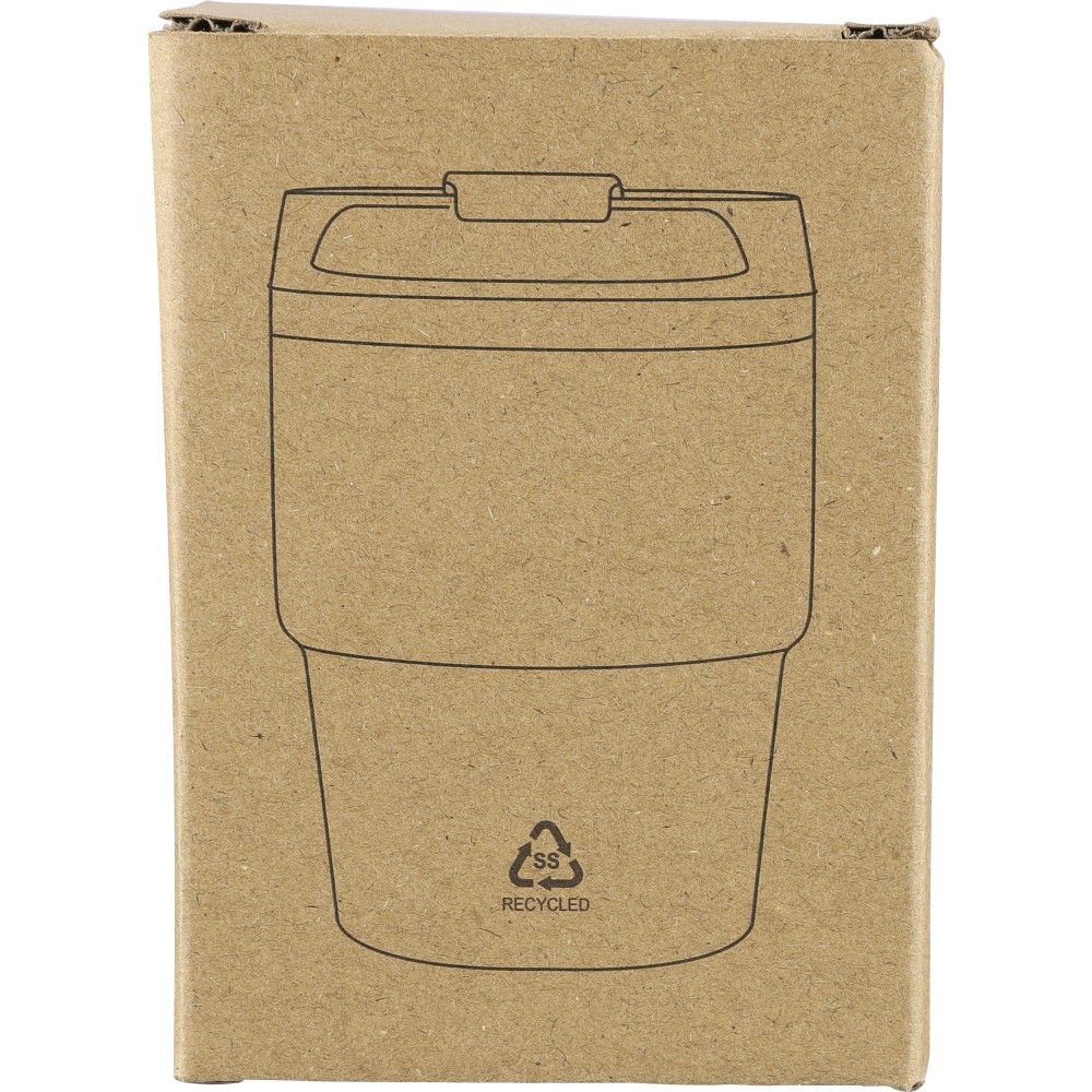 Újrahasznosított rozsdamentes acélból készült, vákuumszigetelésű bögre (175 ml) duplafalú kialakítással és porfestett felülettel, PP csavaros fedéllel. A pohártesten lézergravírozott recycled (újrahasznosított) alapanyagra utaló logó található. Kompakt kialakítása miatt a legtöbb kávégépbe illeszkedik, darabonként barna kartondobozba csomagolva szállítjuk. Emblémázás: Bögredekor
