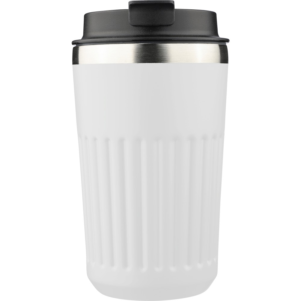 Újrahasznosított rozsdamentes acélból készült utazópohár 400 ml űrtartalommal, duplafalú kialakítással és külső bordázott felülettel. Belső része 304-es, külső része 201-es rozsdamentes acél, PP fedéllel. A pohártesten gravírozott recycled (újrahasznosított) alapanyagra utaló logó található. Darabonként barna kartondobozba csomagolva. Emblémázás: Gravírozás, Tamponnyomás