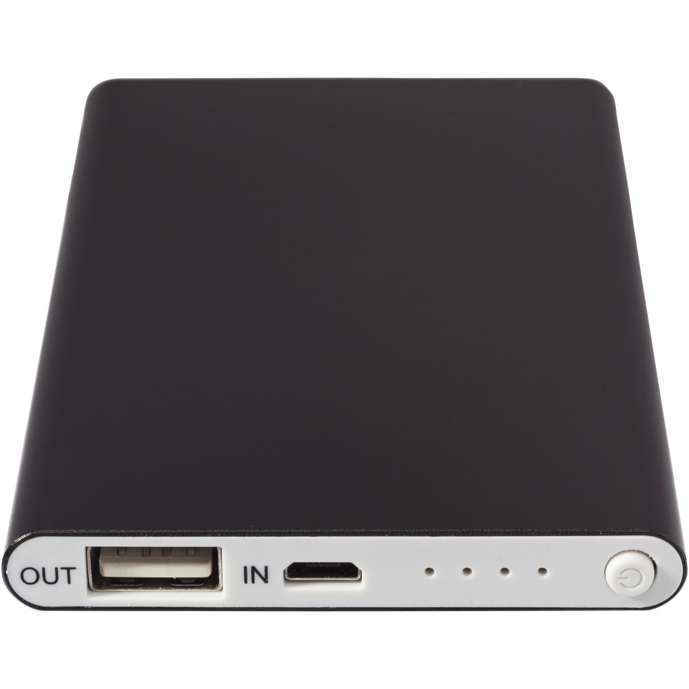 Pep powerbank 4000 mAh kapacitással, A lítium polimer akkumulátorral. Vékony, könnyű modell. A LED jelzőfény töltés közben jelzi a töltöttségi szintet, a kijelző pedig mutatja a maradék energiaszintet. Bemenet 5V/1A, kimenet 5V/1A. A USB / Micro-USB töltőkábelt tartalmazza. Csomagolása fehér doboz. Veszélyes áru, csomagban nem küldhető. Emblémázás: Gravírozás, Tamponnyomás, UV nyomtatás