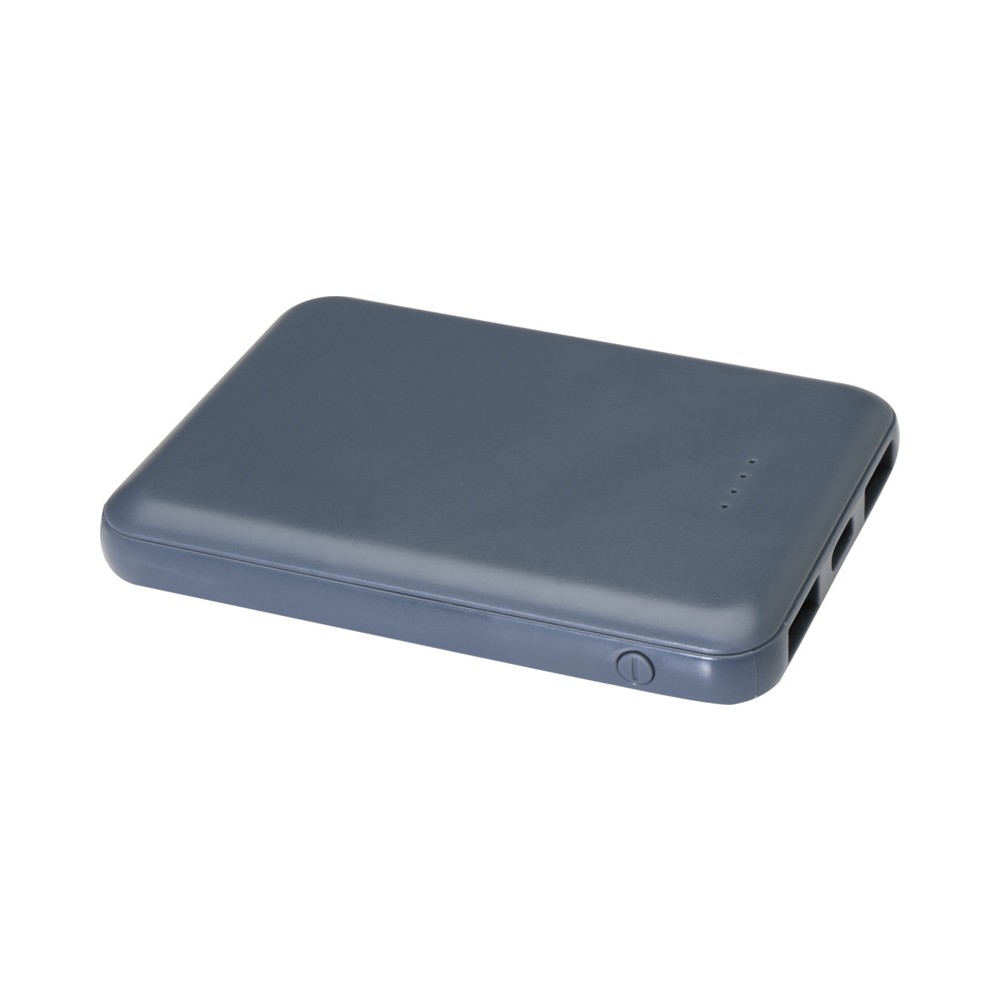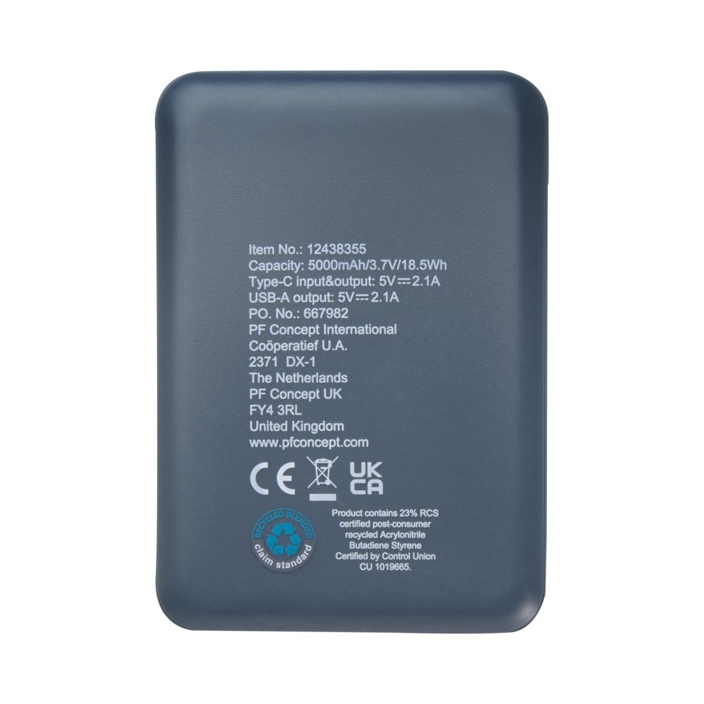 Karcsú és elegáns kialakítású powerbank, Type-C bemeneti/kimeneti porttal és 2 db USB-A porttal, amelyek lehetővé teszik három eszköz egyidejű töltését. A powerbank 5000 mAh kapacitású lítium-polimer akkumulátorral rendelkezik, amely max. 10W teljesítményt biztosít. A powerbank 23%-ban RCS tanúsítvánnyal rendelkező újrahasznosított műanyagból készült. TPE Type-C - USB-A töltőkábellel szállítjuk. Emblémázás: Tamponnyomás
