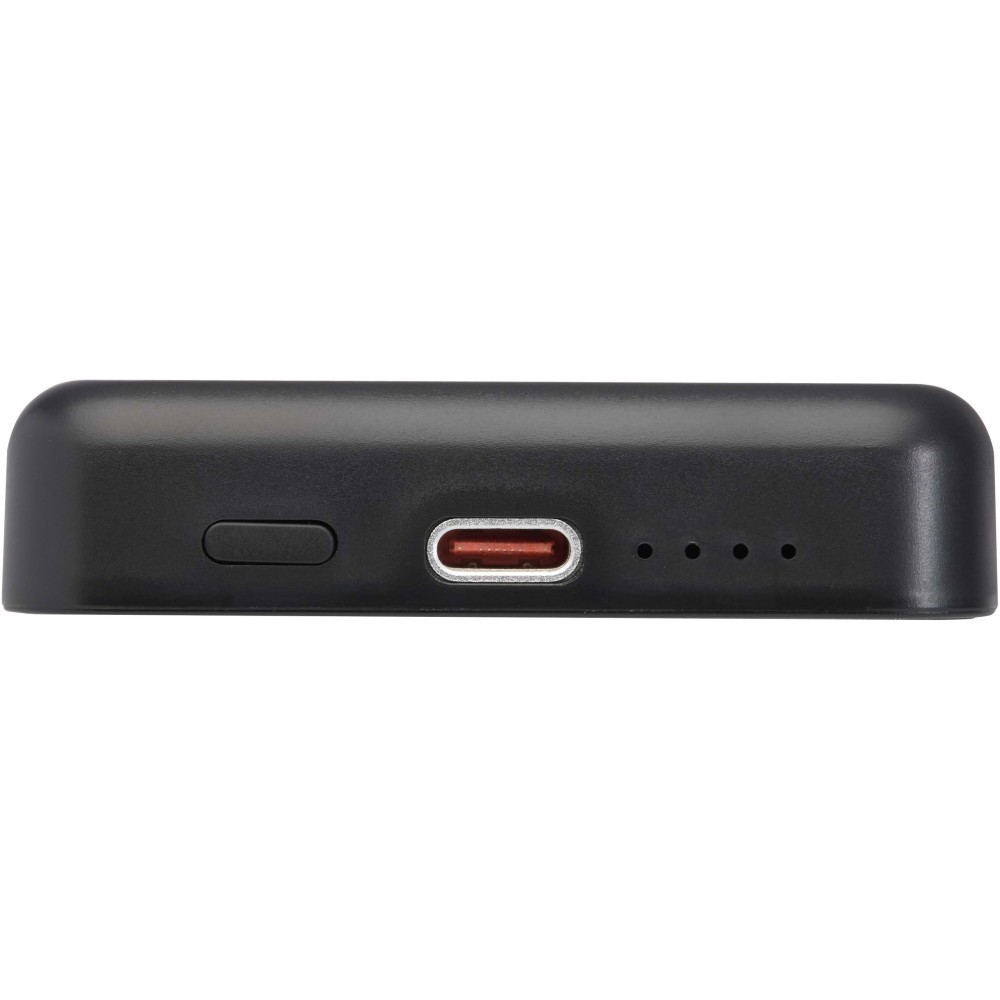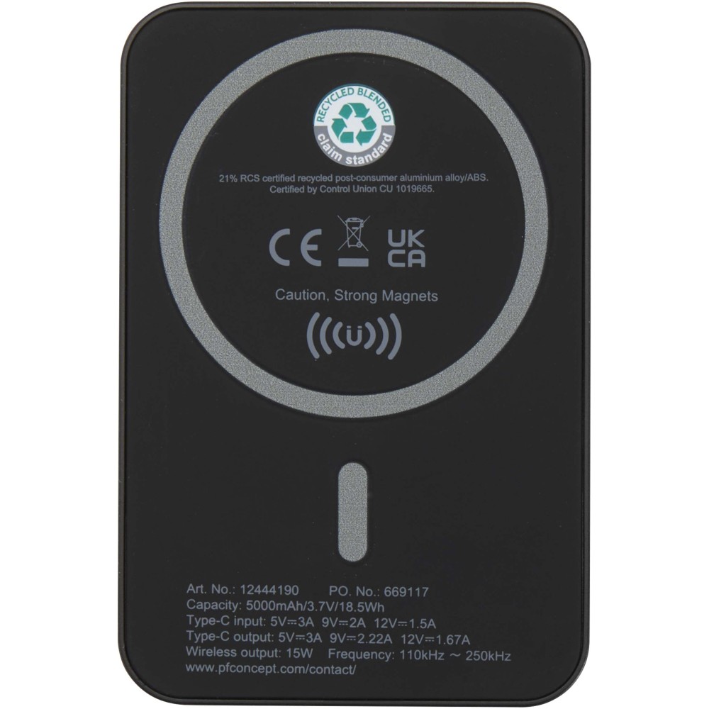 Töltsd fel okosabban és gyorsabban eszközeidet az Acrab 5000 mAh powerbank segítségével, amely újrahasznosított műanyagból készült. Akár 15W mágneses vezeték nélküli töltést kínál kompatibilis okostelefonokhoz, beleértve az iPhone 12 és újabb modelleket. Más, mágneses funkció nélküli, vezeték nélküli töltésre alkalmas készülékekhez fémgyűrűs matricát mellékelnek a pontos illeszkedés érdekében. A powerbank támogatja a 20W vezetékes Type-C gyorstöltést is, és egyszerre két eszközt tud tölteni (vezeték nélküli és vezetékes módban), így ideális választás útközben. A LED jelző folyamatosan tájékoztat a töltés és az akkumulátor állapotáról. Emblémázás: Tamponnyomás, UV nyomtatás