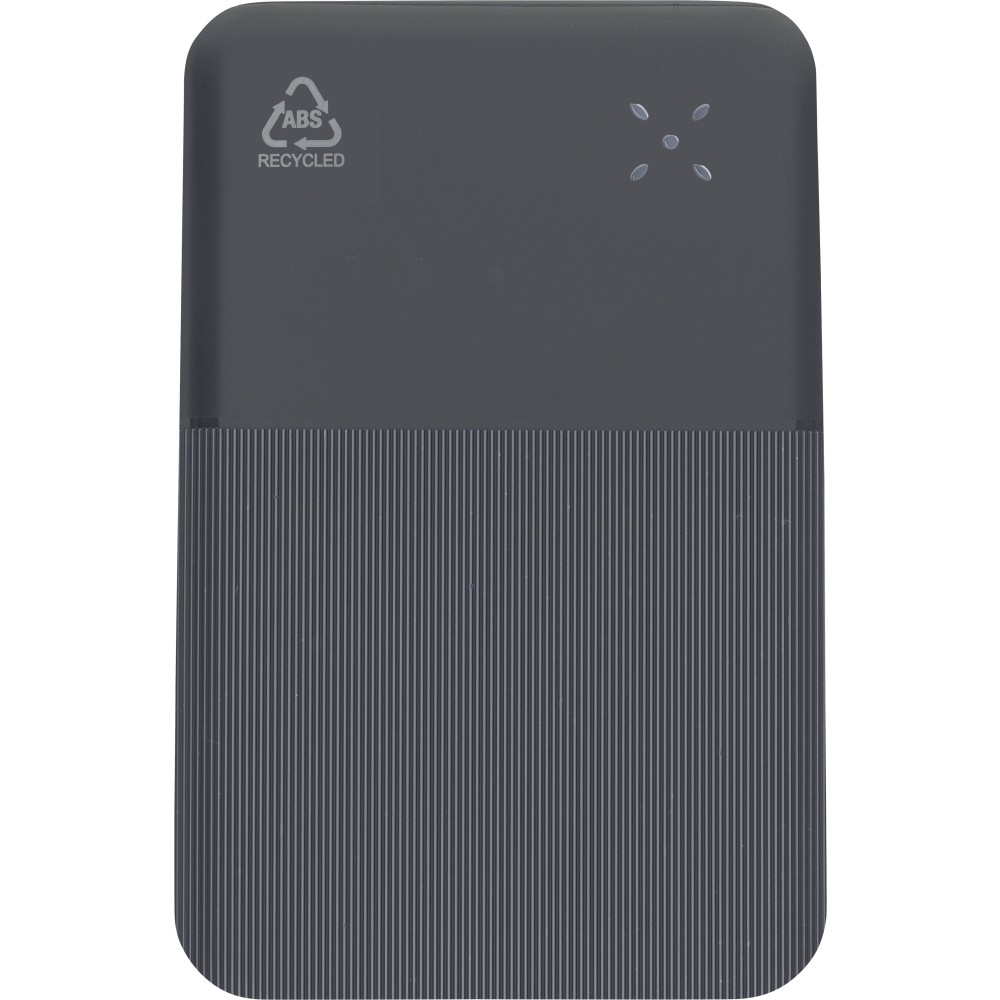 Újrahasznosított ABS anyagból készült powerbank 10 000 mAh kapacitással és 22,5 W gyors töltési teljesítménnyel. Type-C in/out és Type-A bemenettel, digitális kijelzővel, sima és texturált felülettel. Biztonsági védelmekkel ellátva. A hátoldalon gravírozott recycled (újrahasznosított) alapanyagra utaló logó található. Selyempapírral bélelt barna dobozba csomagolva. Emblémázás: UV nyomtatás