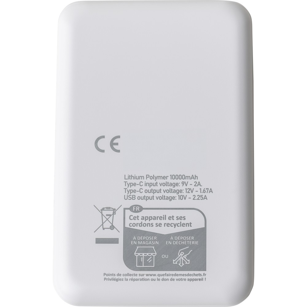 Újrahasznosított ABS anyagból készült powerbank 10 000 mAh kapacitással és 22,5 W gyors töltési teljesítménnyel. Type-C in/out és Type-A bemenettel, digitális kijelzővel, sima és texturált felülettel. Biztonsági védelmekkel ellátva. A hátoldalon gravírozott recycled (újrahasznosított) alapanyagra utaló logó található. Selyempapírral bélelt barna dobozba csomagolva. Emblémázás: UV nyomtatás