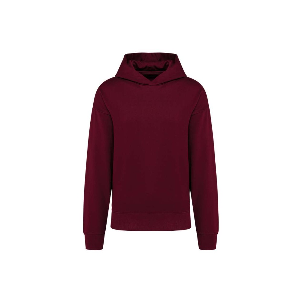 80% cotton / 20% polyester. Oversized fit with dropped shoulders. Brushed fleece. Carded cotton. 1x1 ribbing with a tubular finish on the cuffs and hem. Hidden pocket with invisible zip in the seam on the right side when worn. Cotton hood with double dart. Elastane in the ribbing on the cuffs and at the bottom of the garment to prevent them from going out of shape. Matching twill taped neck. Half-moon finish inside neck. Double overlaid overstitching on cuffs and bottom hem. No brand label on the collar. only a size tag for easy decoration. Emblémázás: Hímzés, Szitanyomás