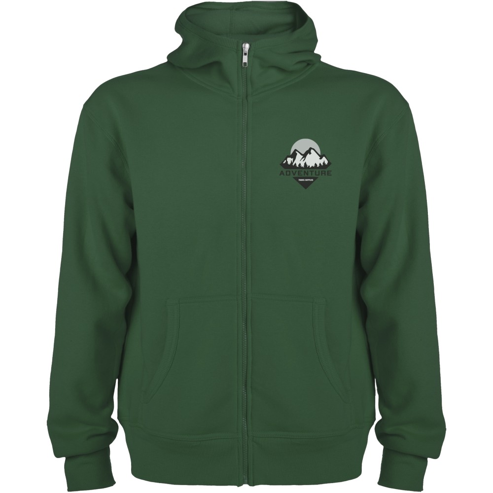 Magasnyakú, kapucnis pulóver teljes cipzárral. Bordázott részletek a kapucni és a zsebek szélén. Kenguru stílusú zseb. 2x2-es bordás kézelő és nyakpasszé. Gyerekméretekben is kapható. 50% pamut és 50% poliészter, 280 g/m2. Emblémázás: Hímzés, Szitanyomás